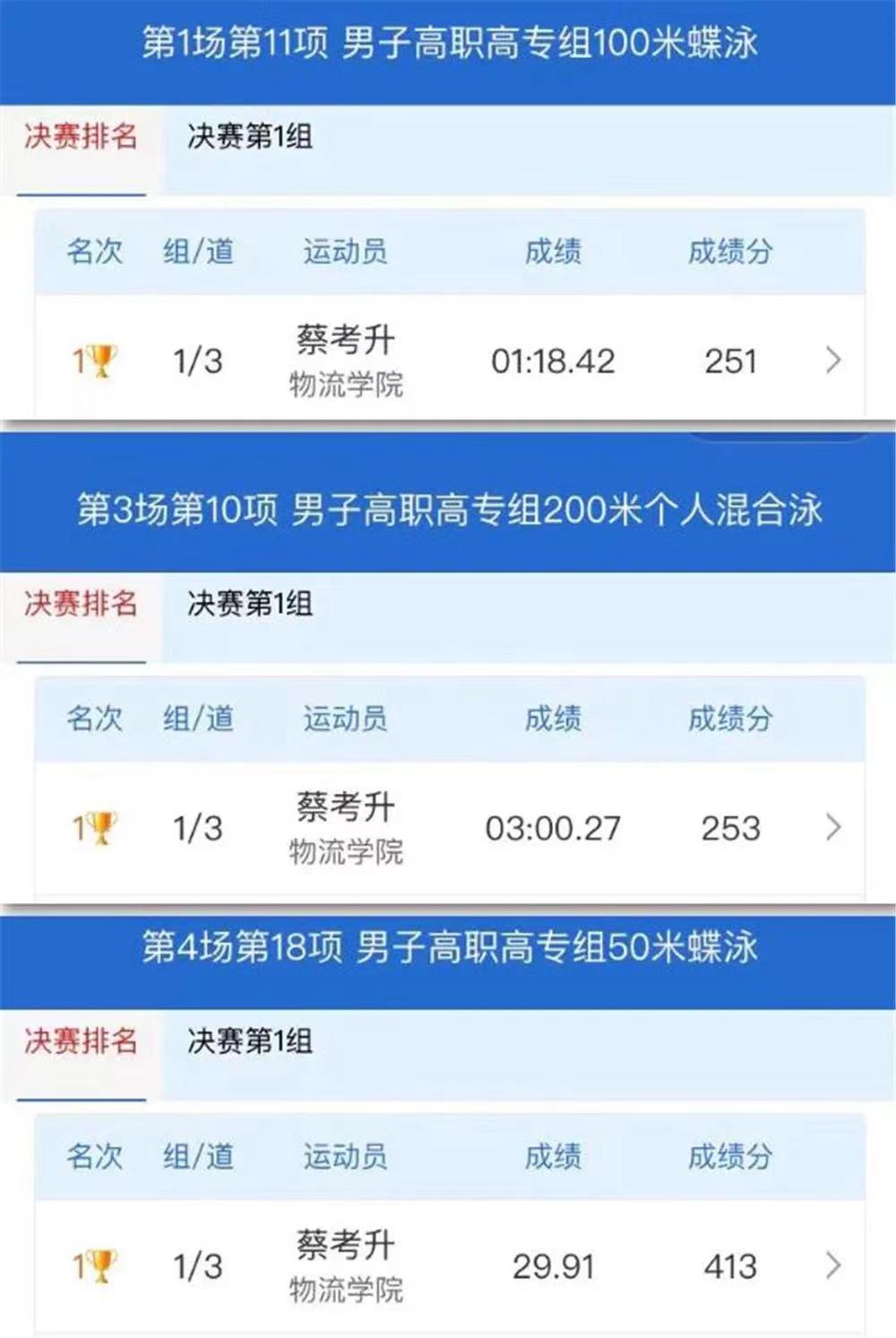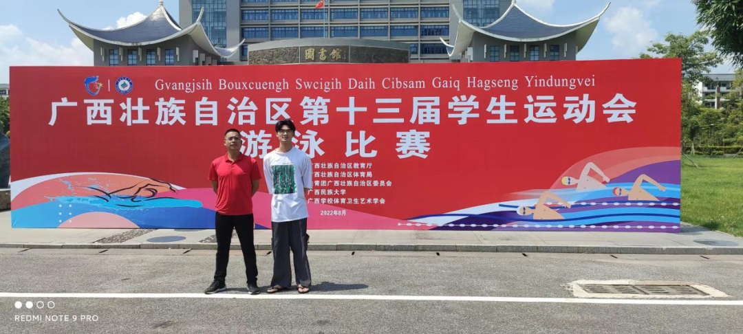 2022年8月21日-23日,广西第十三届学生运动会游泳比赛在广西民族大学相思湖校区举办。beat365在线唯一官网蔡考升同学在比赛中发扬顽强拼搏、敢于突破的精神,取得高职高专男子组100米蝶泳、200米个人混合泳、50米蝶泳三个赛项的冠军,实现beat365官网运动队在区级游泳项目上金牌零的突破,蔡考升成为beat365官网办学3年来学生参加省级赛事诞生的首位三冠王!