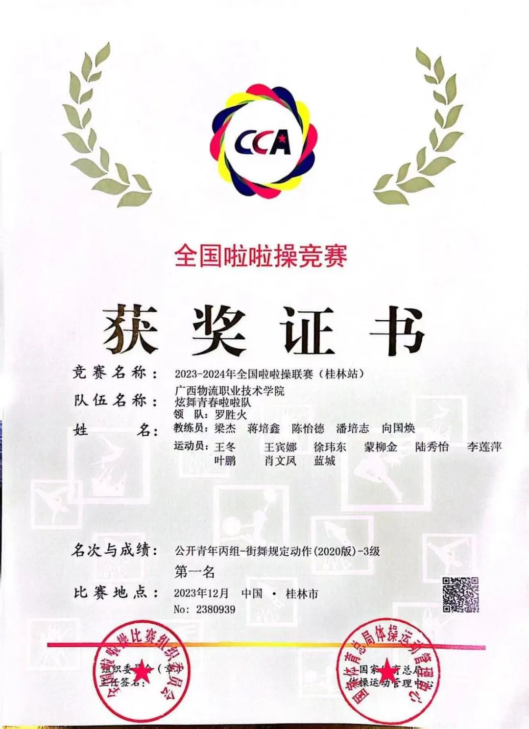 2.全国啦啦操联赛(桂林站)公开青年丙组-街舞规定动作(2020版)—3级:冠军;