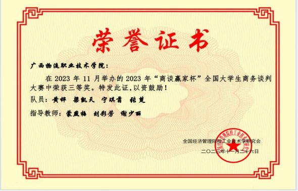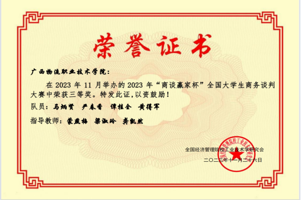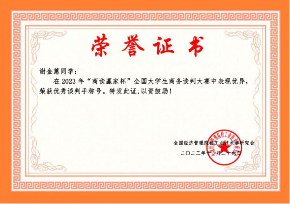 近日,2023年“商谈赢家杯”全国大学生商务谈判大赛赛程落下帷幕。本届大赛吸引了全国40余所高校160余支队伍同场竞技。beat365官网人文教育学院组织的四支队伍分别荣获大赛(网络赛高职组)一等奖1项、二等奖1项、三等奖2项,其中谢金蕙获得“优秀谈判手”称号。