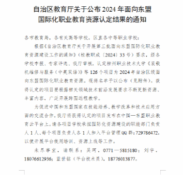 根据《自治区教育厅关于开展第三批面向东盟国际化职业教育资源建设工作的通知》(桂教职成〔2024〕33 号)要求,经各学校申报、专家评选、广西壮族自治区教育厅审核,认定了中高职院校共 126 个项目为 2024 年自治区级面向东盟国际化职业教育资源。