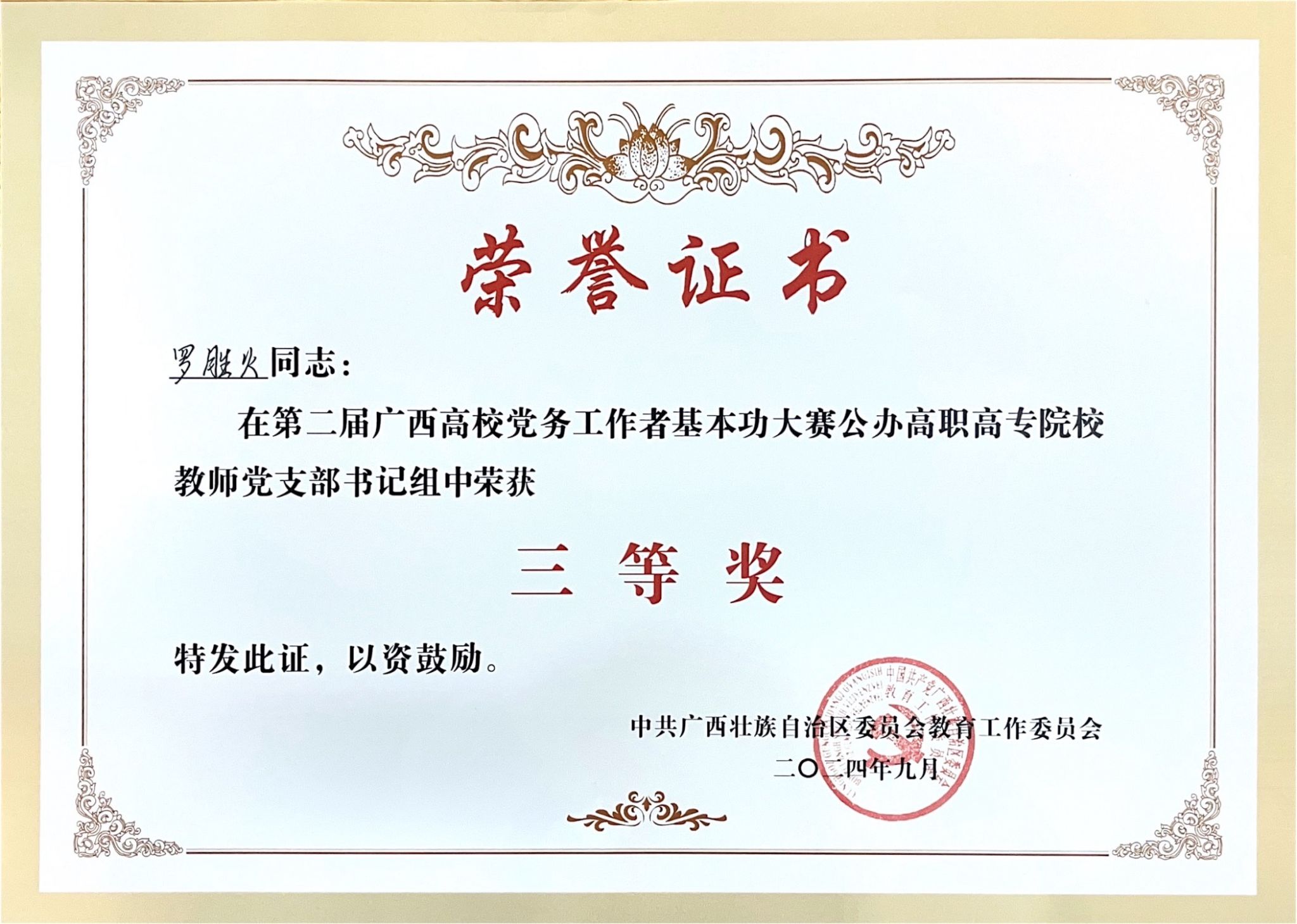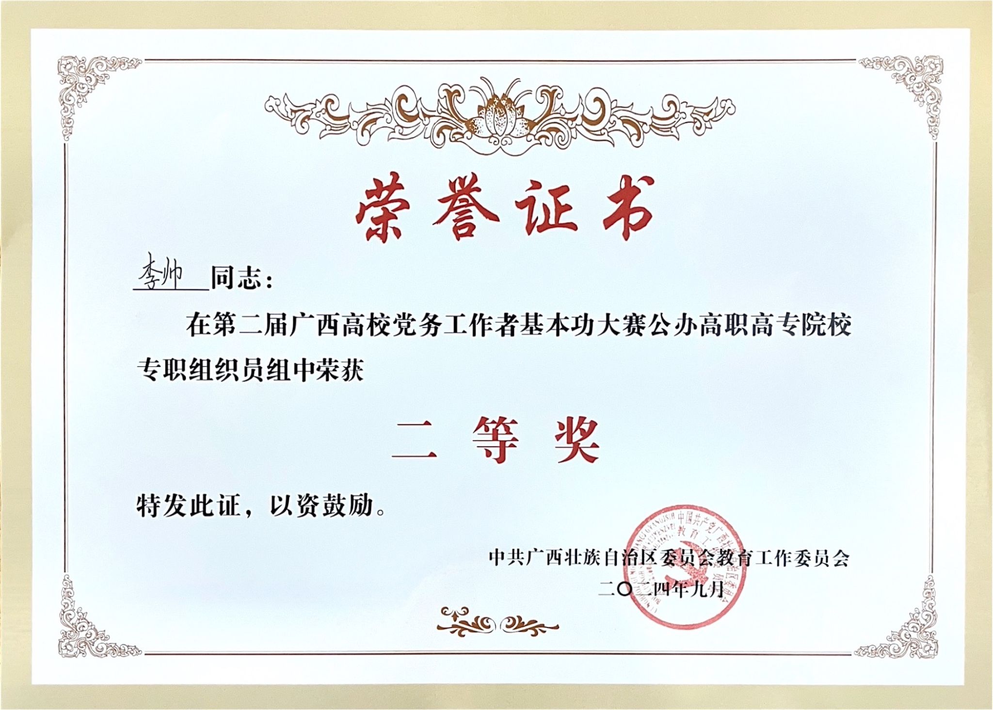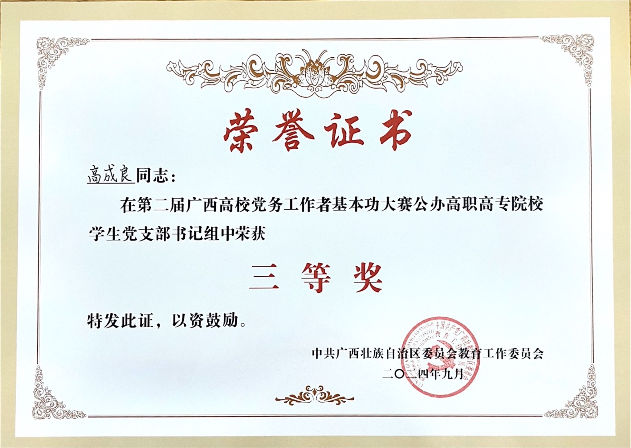 2024年9月19日至20日,自治区教育工委主办的第二届广西高校党务工作者基本功大赛(公办高职高专组)在广⻄工商职业技术学院落下帷幕。