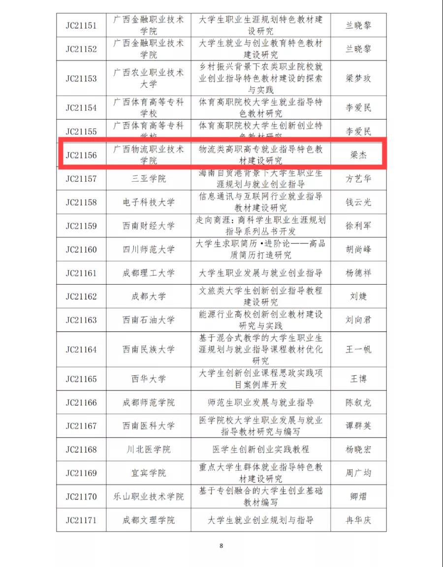近日,教育部直属单位全国高等学校学生信息咨询与就业指导中心发布了《2021年全国高校就业创业特色教材课题立项通知》,beat365官网党委宣传部、人文教育学院梁杰老师主持的《物流类高职高专就业指导特色教材建设研究》(项目编号JC21156)获批立项。据悉,此次就业创业特色教材课题在全国100多所高校中共立项199项。