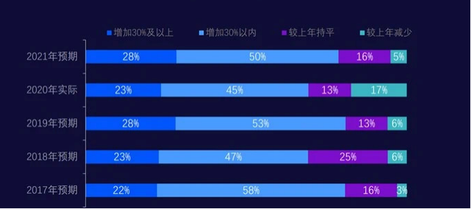 随着数字经济全面发展,线下生活场景进行线上化转移,购物消费、生活、办公及出行等行业用户规模呈现快速增长,用户的使用程度也在不断加深。据报告显示,疫情没有影响企业对数字营销的投资信心。2020年数字营销实际增长率16%(高于预期),2021年的预期增长恢复到20%。预计2021年,78%的企业表示将增加数字营销支出。