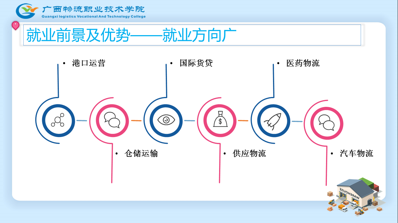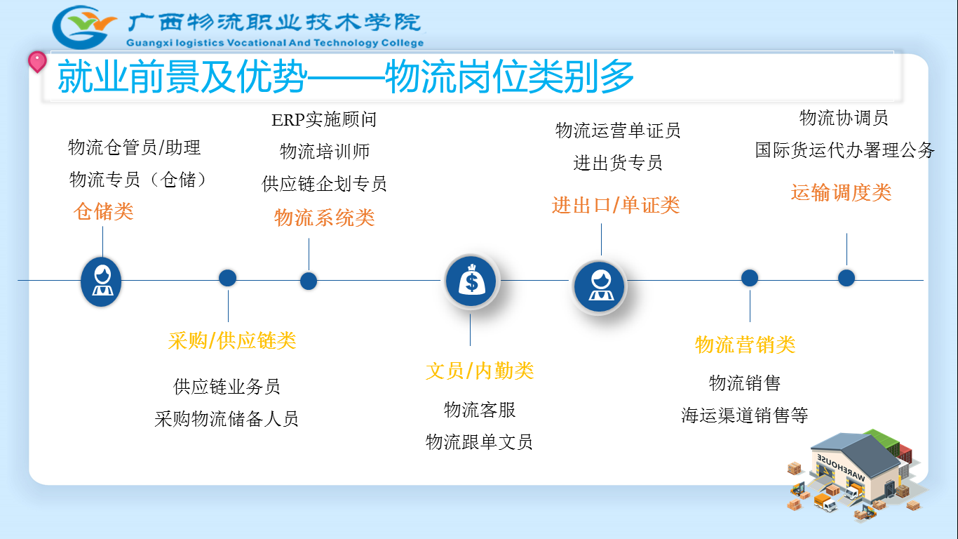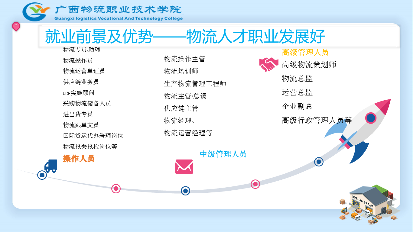 职业面向:智慧物流业务管理与咨询、现代物流装备操作与运维、物流工程项目管理、物流系统与设备销售技术支持等工作。