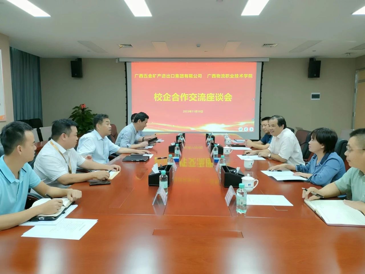 11月10日下午,学院党委副书记、院长朱海强带队到广西五金矿产进出口集团有限公司开展校企合作交流座谈,并举行产教融合实训基地揭牌仪式。广西五金矿产进出口集团党委书记、董事长曹津津,党委副书记、副董事长、总经理夏隽出席座谈交流和揭牌仪式。