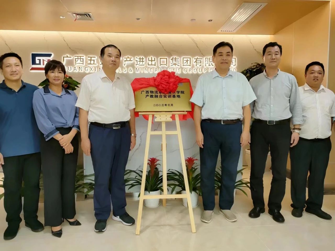 座谈会后,曹津津与朱海强共同为广西五金矿产进出口集团有限公司—beat365在线唯一官网产教融合实训基地揭牌。