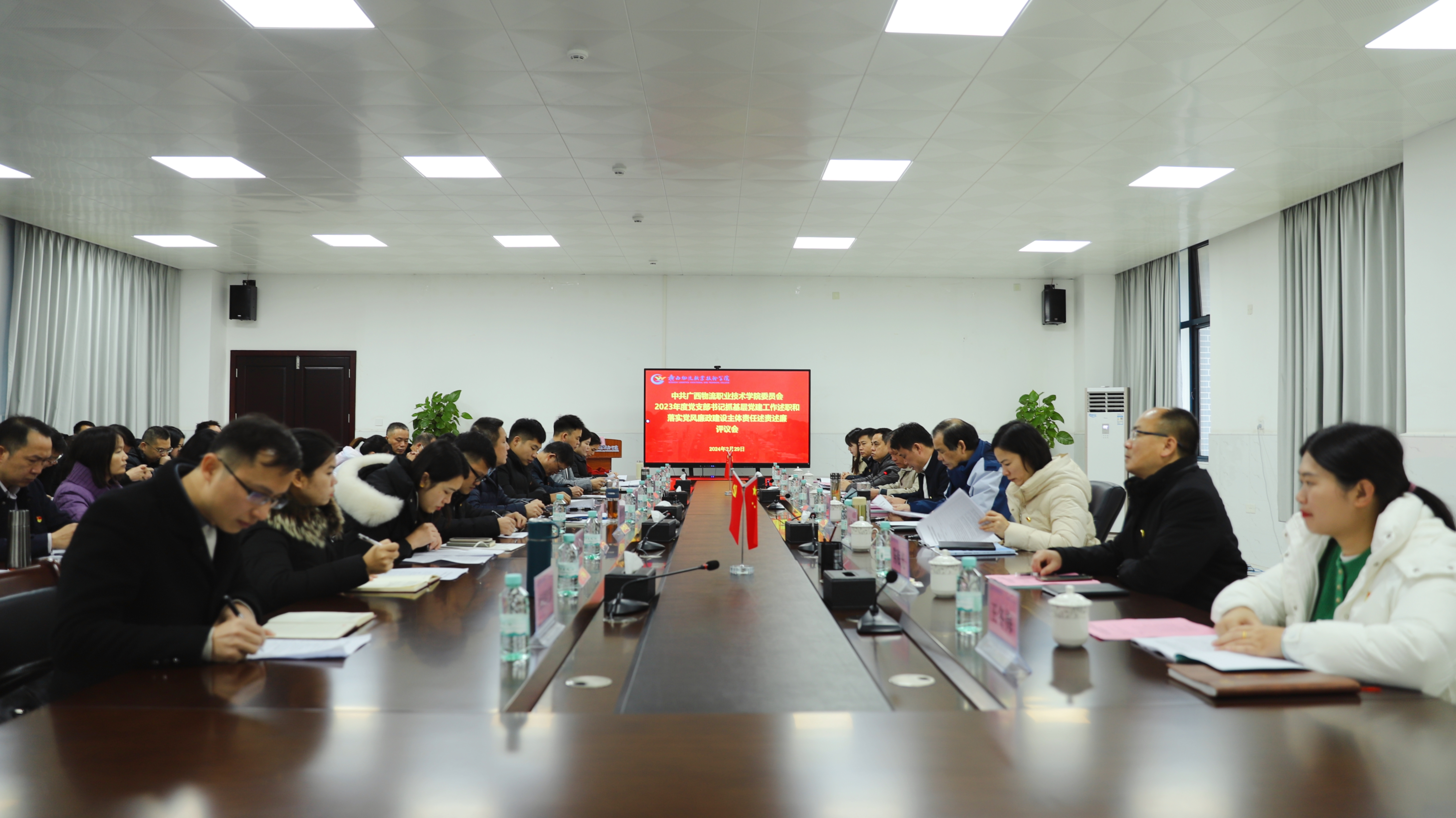 2024年2月29日上午,学院召开2023年度党支部书记抓基层党建工作述职和落实党风廉政建设主体责任述责述廉评议大会。集团公司党群工作部、纪检监察部有关同志到会指导,学院党委书记韦光茂主持会议并讲话,领导班子成员朱海强、杨一笔、覃丽燕、陈继文、陈赋光、梁杰参加会议。