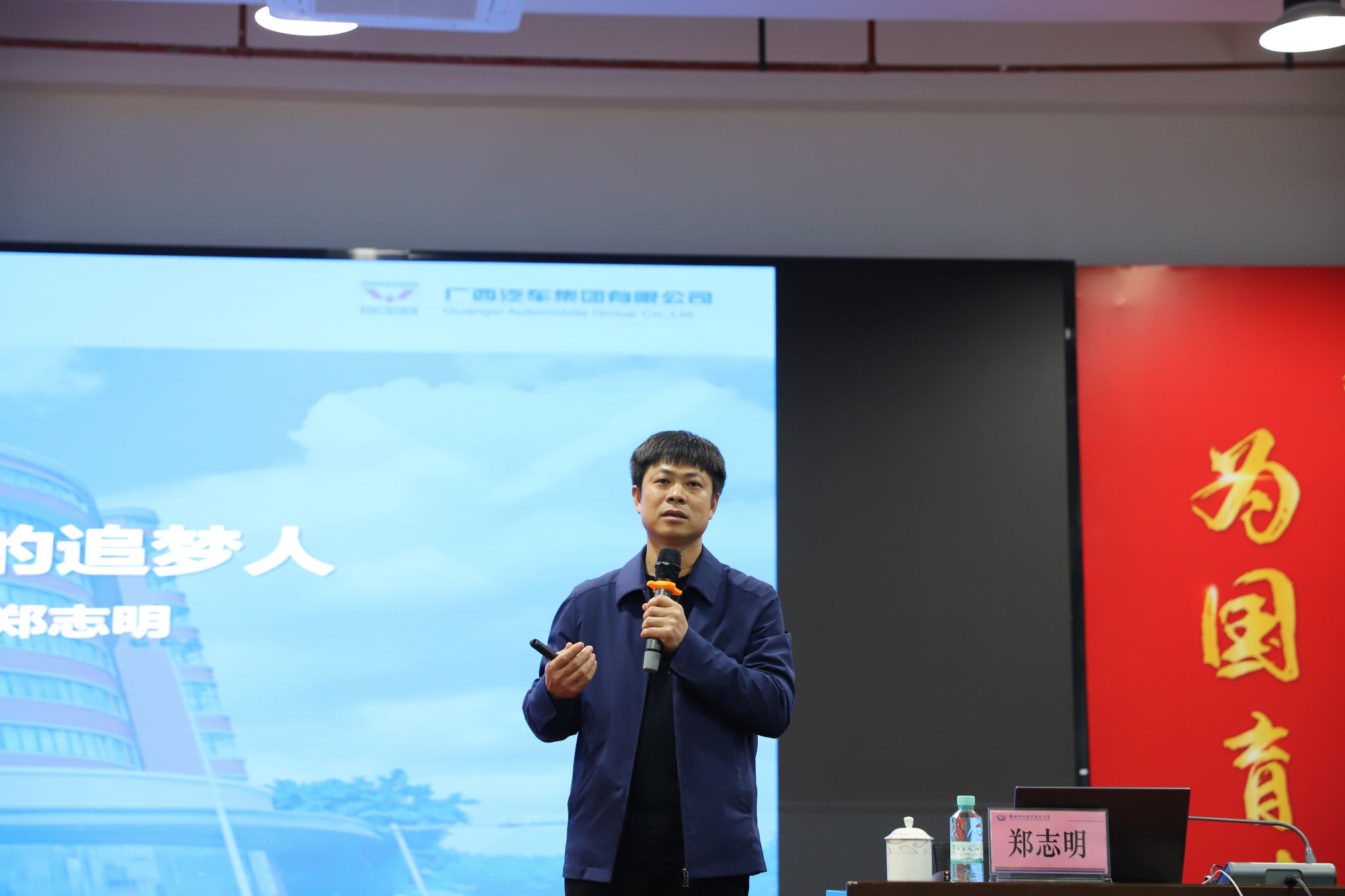 2024年3月20日,党的二十大代表、新时代汽车“智”造大国工匠、广西汽车集团有限公司首席技能专家郑志明应邀到beat365官网为师生讲授思政课。学院党委书记韦光茂主持课堂,广西物产投资发展集团有限公司总经理莫如涛,学院党委委员、副院长、宣传部部长梁杰现场聆听授课。