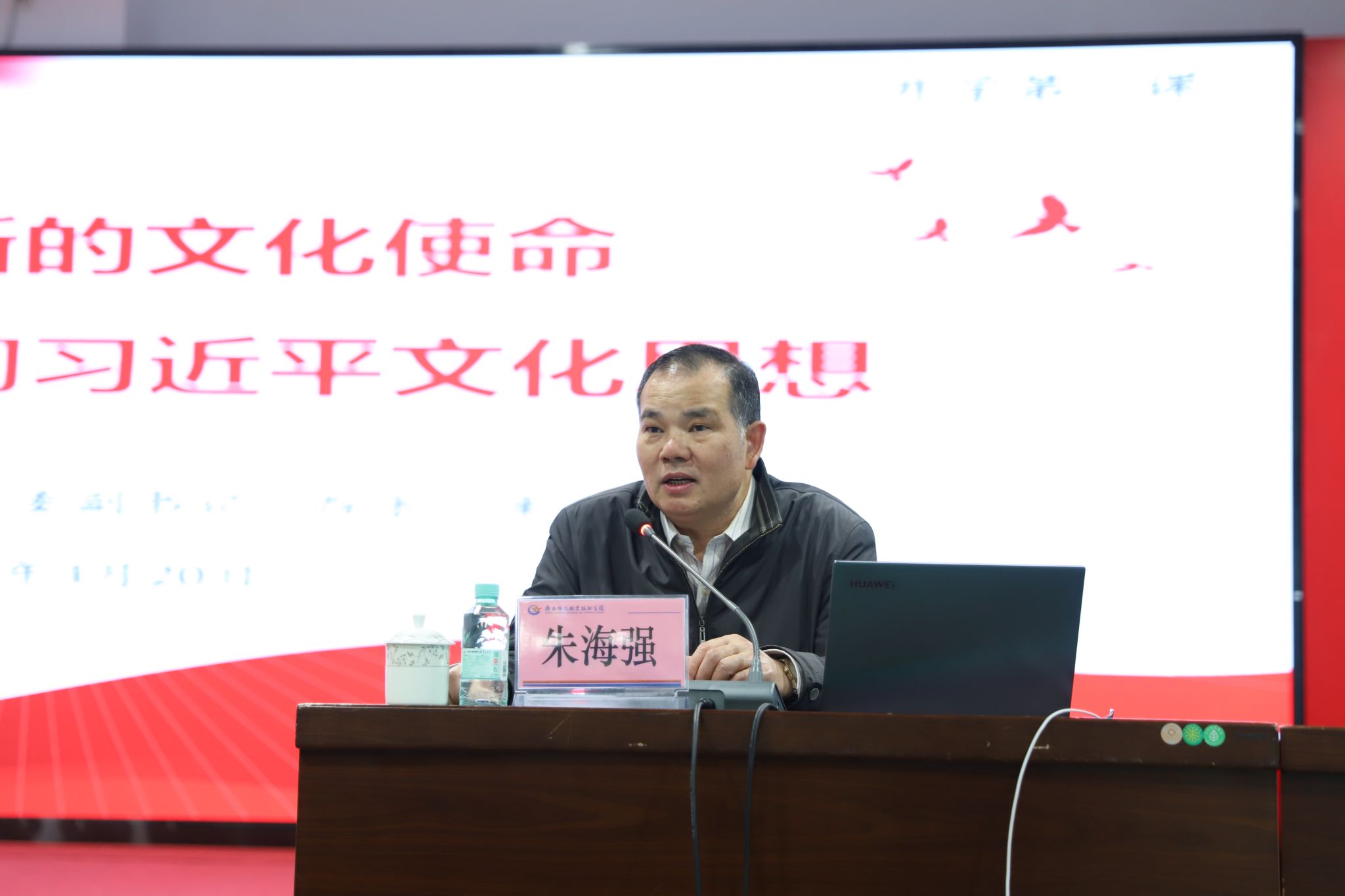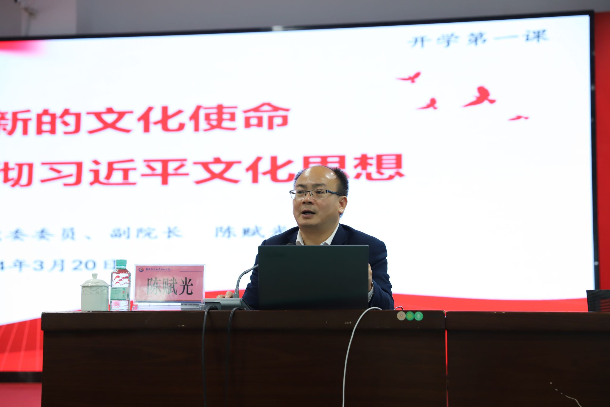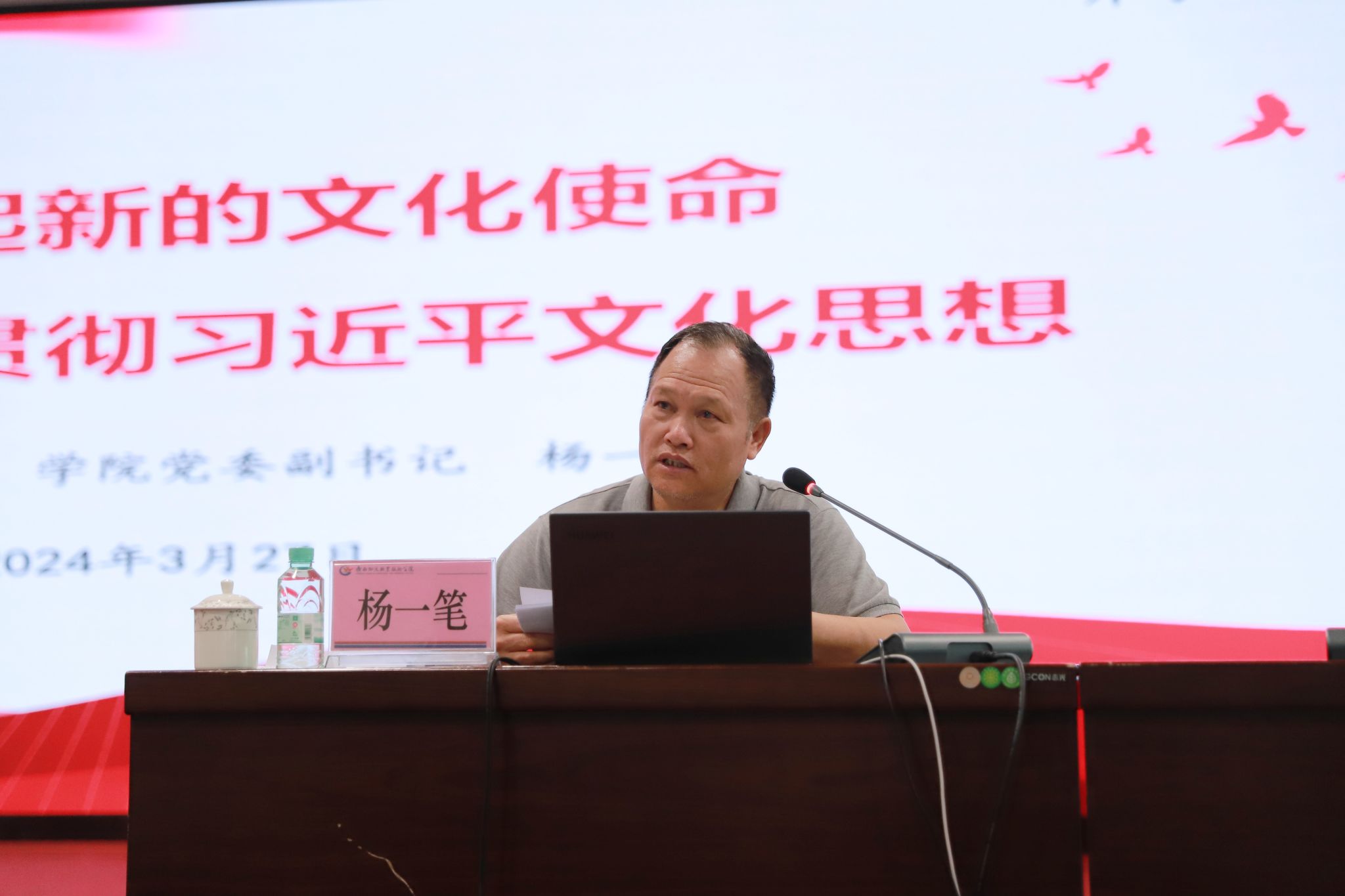 授课领导以《担负起新的文化使命—学习贯彻习近平文化思想》为题,围绕“中国共产党人的文化奋进历程,新时代文化建设的理论结晶与思想引领,在新的起点上更好担负起新的文化使命,以习近平文化思想为指导、勇担高校文化育人新使命,新时代青年要担负起新的文化使命”等5个方面同大家交流,内容丰富,案例详实,层级分明,号召同学们深刻理解习近平文化思想,增进文化自信,担负起新的文化使命,在新时代新征程上继续推动文化繁荣、建设文化强国、建设中华民族现代文明。