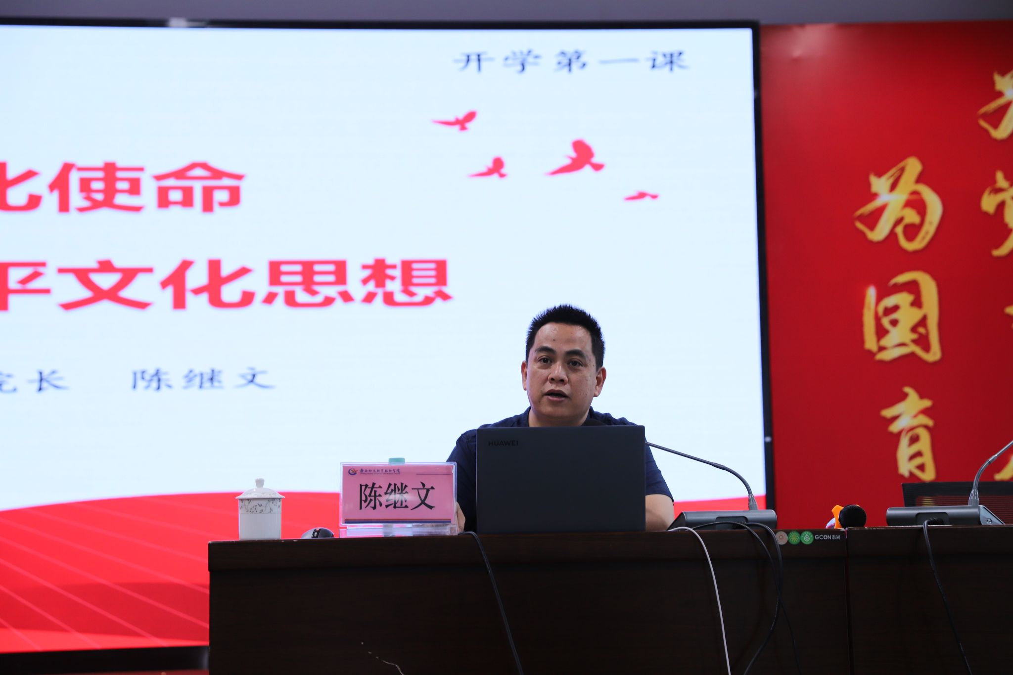 为深入学习贯彻习近平文化思想,全方位增强中华文明在校园的传播力影响力,增强文化自信。2024年3月19-28日,在党委书记韦光茂、院长朱海强的带领下,领导班子成员杨一笔、覃丽燕、陈继文、陈赋光、梁杰分别为联系的二级学院学生讲授“开学第一课”,通过“物院大讲堂”的形式为学生带来了一堂堂富有思想性、理论性、亲和力的思想政治理论课。