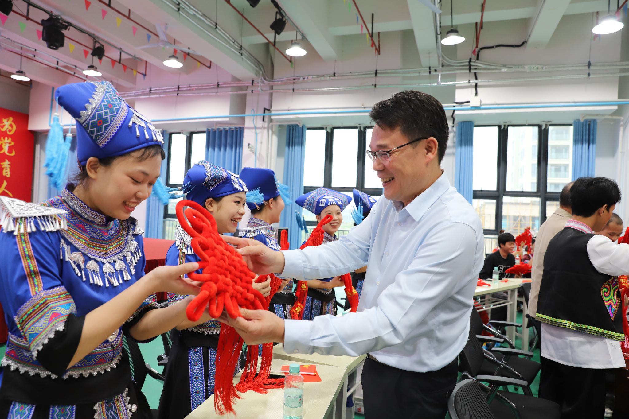 与会领导为参会学生代表赠送同心中国结,并勉励各民族学生要在担当中历练,勇做奋进者,以昂扬的前进姿态为铸牢中华民族共同体意识添砖加瓦。