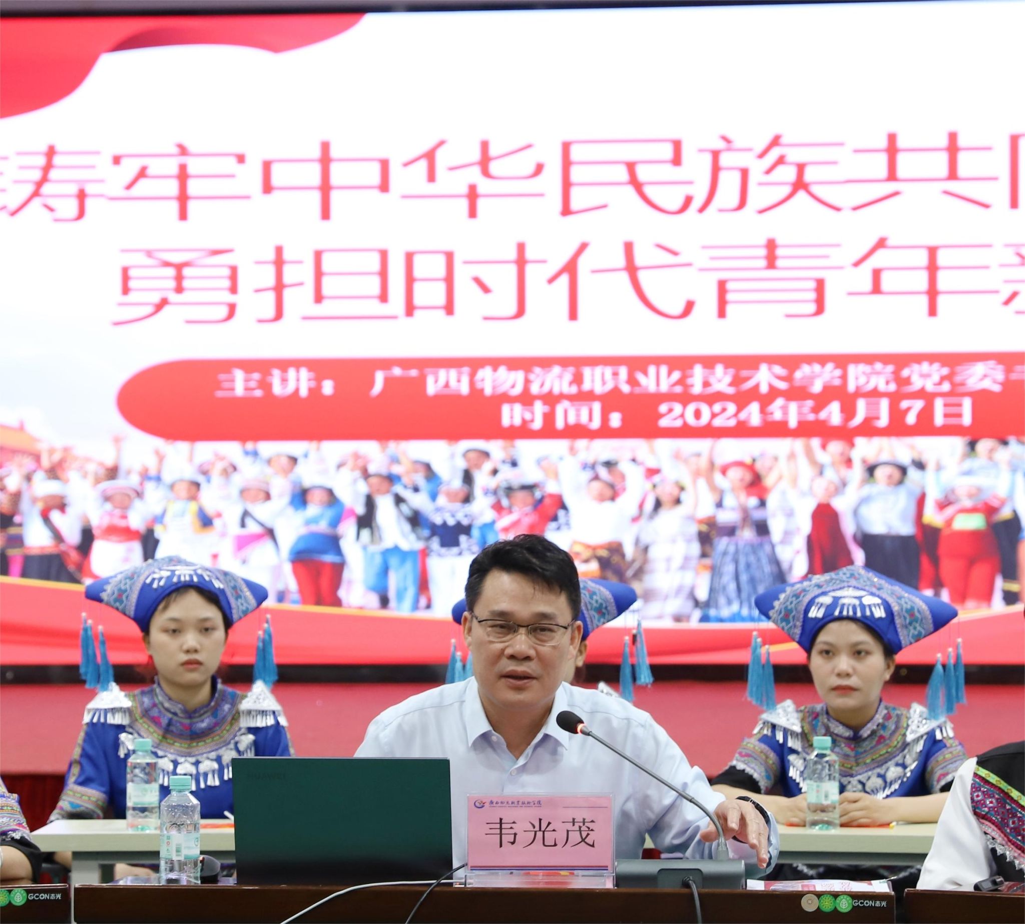 韦光茂以《铸牢中华民族共同体意识,勇担时代青年新使命》为主题,从中华民族共同体意识的内涵、铸牢中华民族共同体意识的重大意义、实践路径、青年担当等四个方面为学生授课,并对各民族学生提出殷切希望,一是要增强对中华文化的认同;二是要坚定理想信念;三是要积极投身社会实践,通过增强民族认同感、促进民族团结、推动创新实践等方式,为中华民族伟大复兴贡献青春力量。