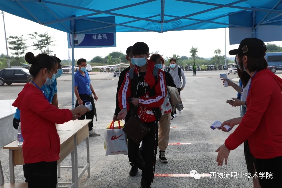 按照上级部门疫情防控相关规定和要求,学校制定了周密细致的工作方案,新生开学前两周就开始要求学生在家进行健康观察并填写《居家观察信息表》。为保障新生的安全健康,学校在贵港高铁站、汽车南站、汽车西站、汽车总站设立新生接待点,同时安排学生志愿者在各接站点引导新生乘坐校车及专线公交车,确保将新生安全送达学校。为了让新生安全进入学校,学校在校门设立了专门的入校通道,所有新生有序排队核验身份,按照工作人员的指引,进行行李消毒,体温检测,体温正常者方可进入校园。新生到校前,学校就对学生宿舍、食堂等场所进行了定期消毒清洁工作。