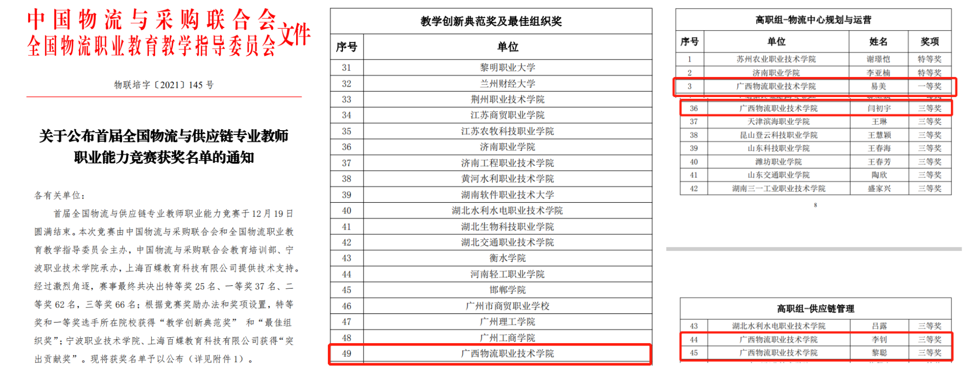 2021年,beat365官网荣获首届全国物流与供应链专业教师职业能力竞赛的教学创新典范奖及最佳组织奖,物流管理学院教师荣获“物流中心规划与运营”赛项一等奖与“供应链管理”赛项三等奖,学生荣获2021年广西职业院校技能大赛荣获个人赛三等奖;物流商学院荣获全国职业院校数智化企业经营管理沙盘大赛广西赛区一等奖、全国总决赛三等奖;物流交通学院教师在广西第一届职业技能大赛中获“优胜奖”。学校不断加强高技能人才培养,为社会发展培养输送更多高素质技术技能人才。