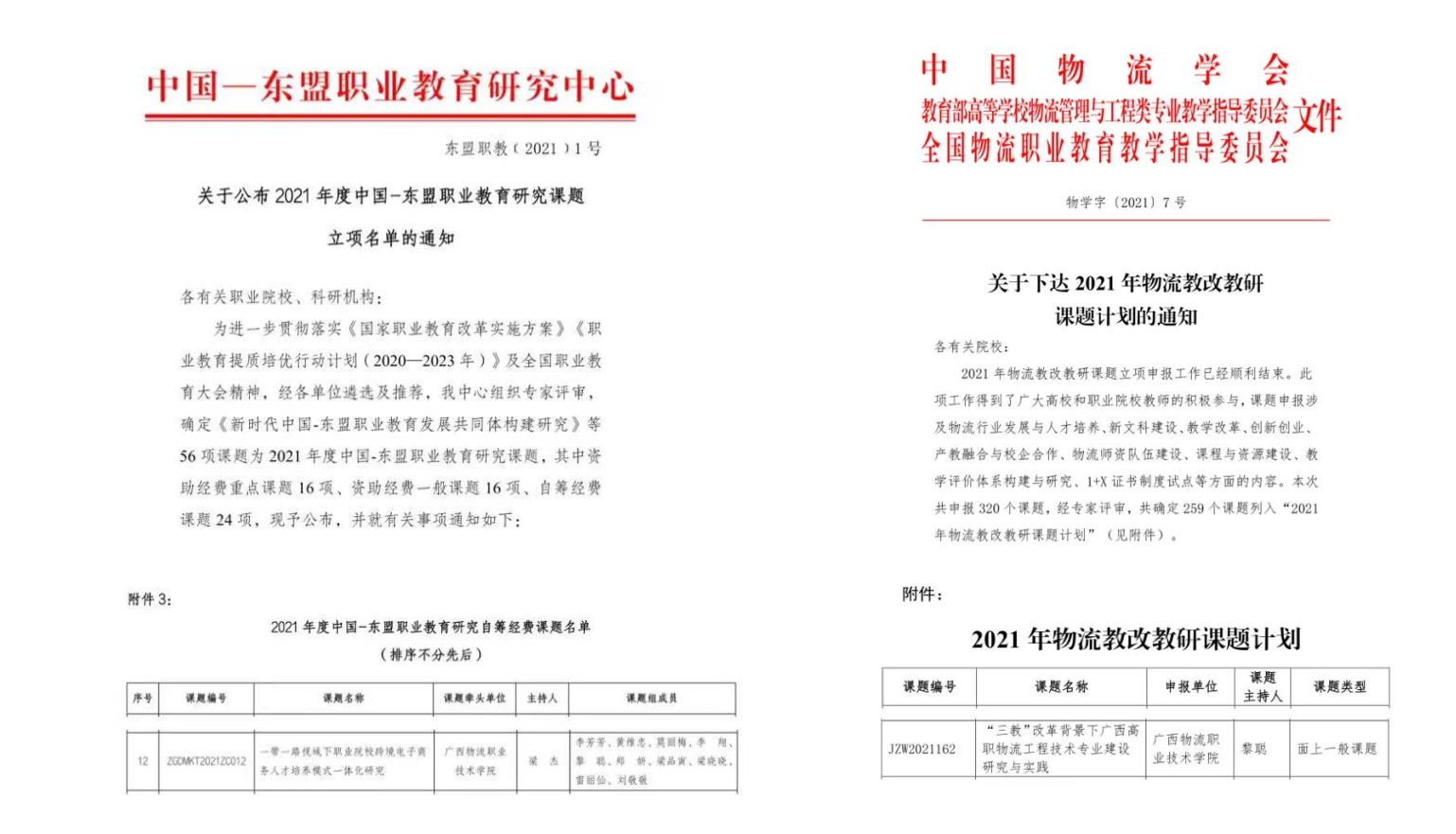 2021年,beat365官网获批2021年广西高校中青年教师基础能力提升项目8项、2021年全国高校就业创业特色教材课题立项1项、2021全国物流行业物流教改教研课题立项1项、2021年度中国-东盟职业教育研究课题立项1项、2021年度广西职业教育教学改革研究重点项目1个,一般项目2个,学校科研成果取得实质性进展。
