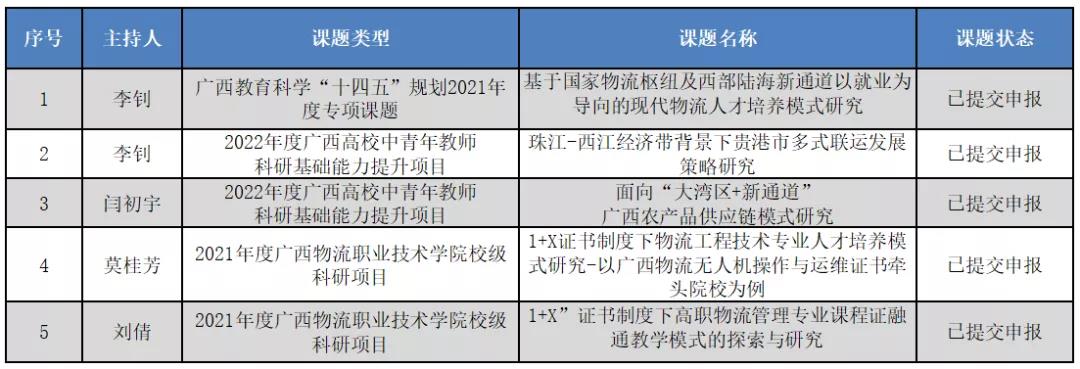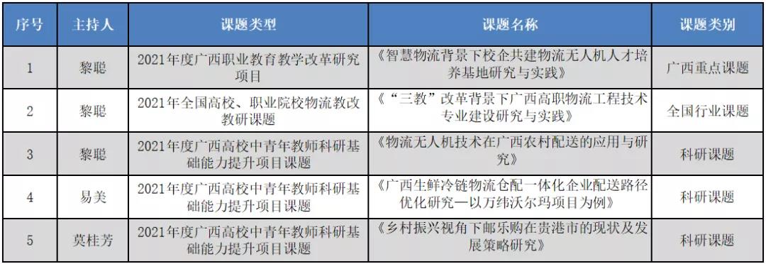 四.以研促教 以赛促学 1.课题引领,以研促教 秉持“课题引领、以研促教”的精神,鼓励教师申报课题项目,2021年全校首个教育教学改革重点课题获得立项、全国高校物流教改教研课题立项1项、广西中青年科研课题3项。 已提交申报未批复立项课题5项,其中十四五规划课题1项、2022年中青年科研课题2项、2021年校级课题2项。 2.以赛促学,学赛结合 高度重视各级各类技能大赛,科学指导积极开展师生技能竞赛活动。在首届全国物流与供应链专业教师职业能力竞赛中,易美荣获一等奖,黎聪、李钊、闫初宇分别荣获三等奖。学院荣获教学创新典范奖及最佳组织奖。