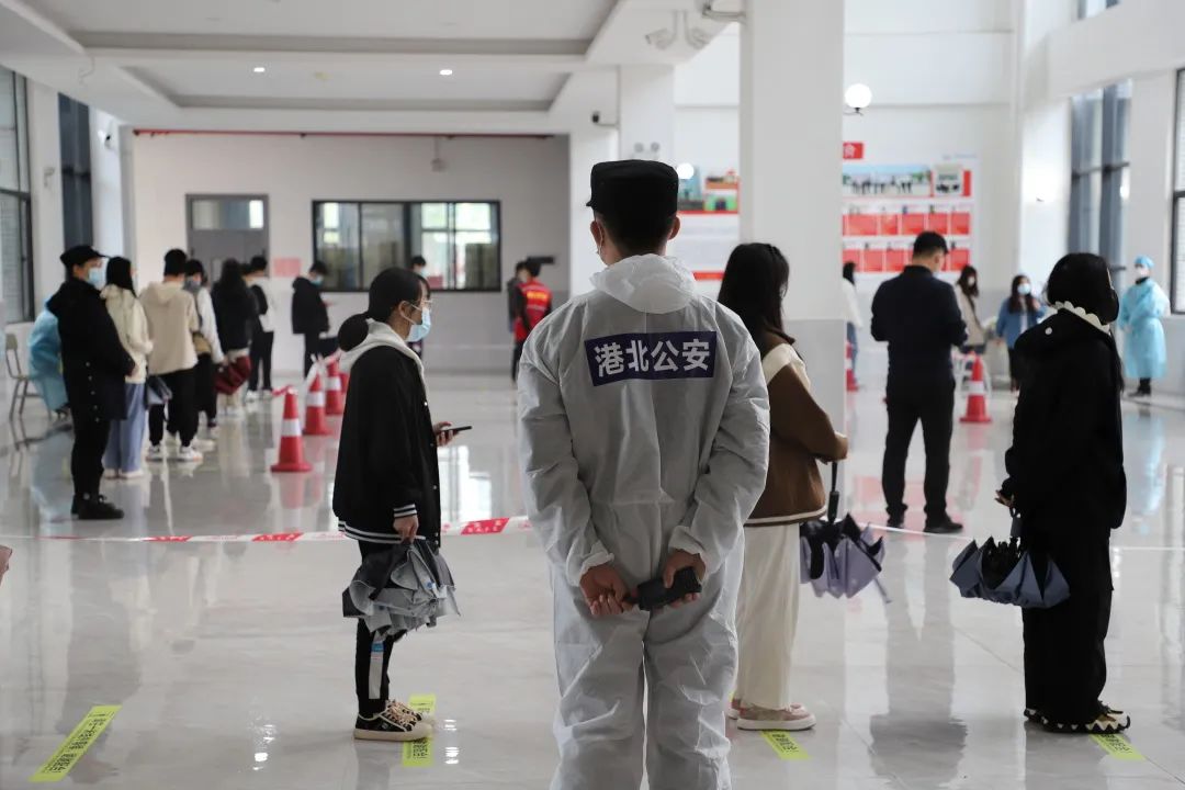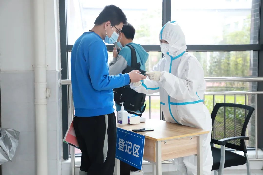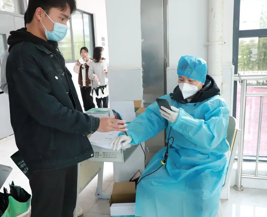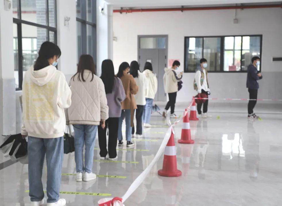 本次演练重点围绕学校全员核酸检测组织环节开展。核酸检测现场设置了体温测量区,待检等候区,信息采集区,核酸采样区,临时隔离区等,设置6条检测通道并进行隔断。演练现场,学校各部门、各二级学院密切配合、衔接紧凑。受检人员在待检区集合,按照10人一组,1米间隔,经扫码录入信息、咽试子采样、按离场路线撤离采样区等环节有序高效完成检测流程。