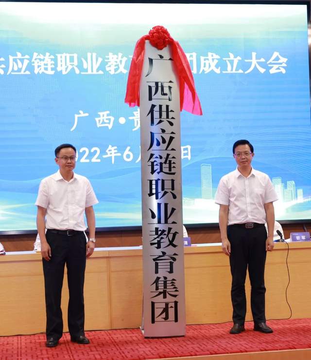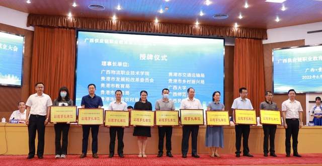 会上,贵港市人民政府副市长周春涌、广西现代物流集团党委副书记欧军为“广西供应链职业教育集团”成立揭牌,并为广西供应链职教集团理事长单位、副理事长单位颁发牌匾。广西现代物流集团副总经理、物流学院党委书记李卫国,贵港市人民政府副秘书长覃华宁为理事单位颁发牌匾。