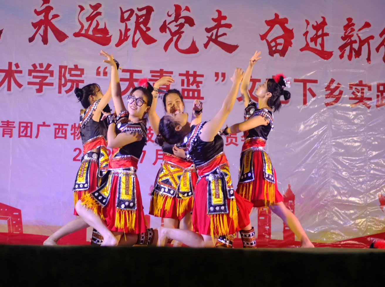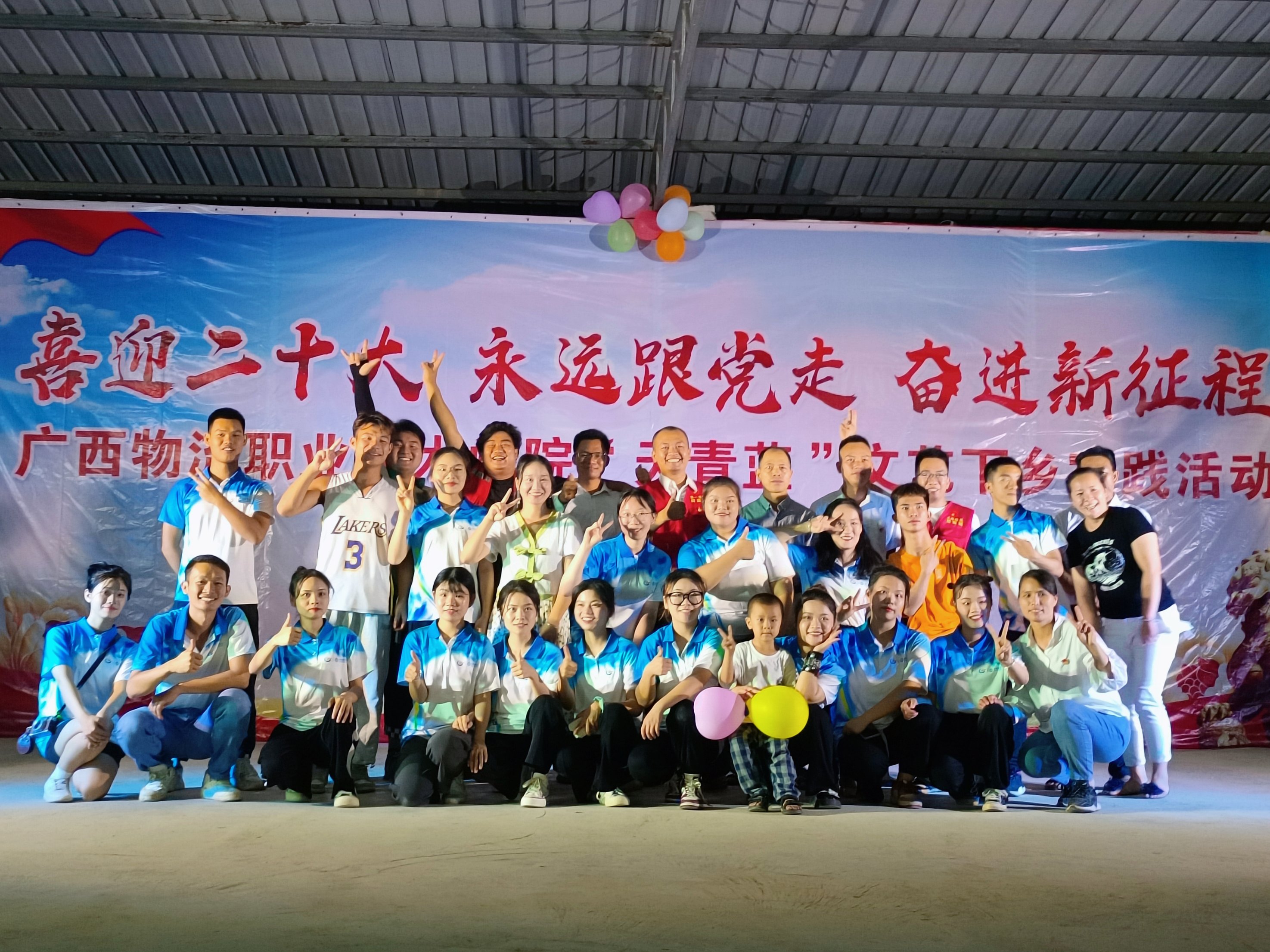 7月25日晚,物流管理学院“物泽八桂”服务团、物流商学院“八桂红商”实践团联合广西现代物流集团驻村工作队在多浪村文化广场举办“喜迎二十大 永远跟党走 奋进新征程”——beat365在线唯一官网“天青蓝”文艺下乡实践汇演,为基层群众送上了一场简单而别致的文化演出。实践团立足文化惠民,传承红色基因、弘扬革命精神,通过送文艺演出到基层,丰富基层群众精神文化生活,提振广大群众乡村振兴精气神,坚定现场观众对中国共产党的情感,对实现国家富强、民族振兴、人民幸福的信心和决心,激情唱响奋斗新时代的昂扬旋律。
