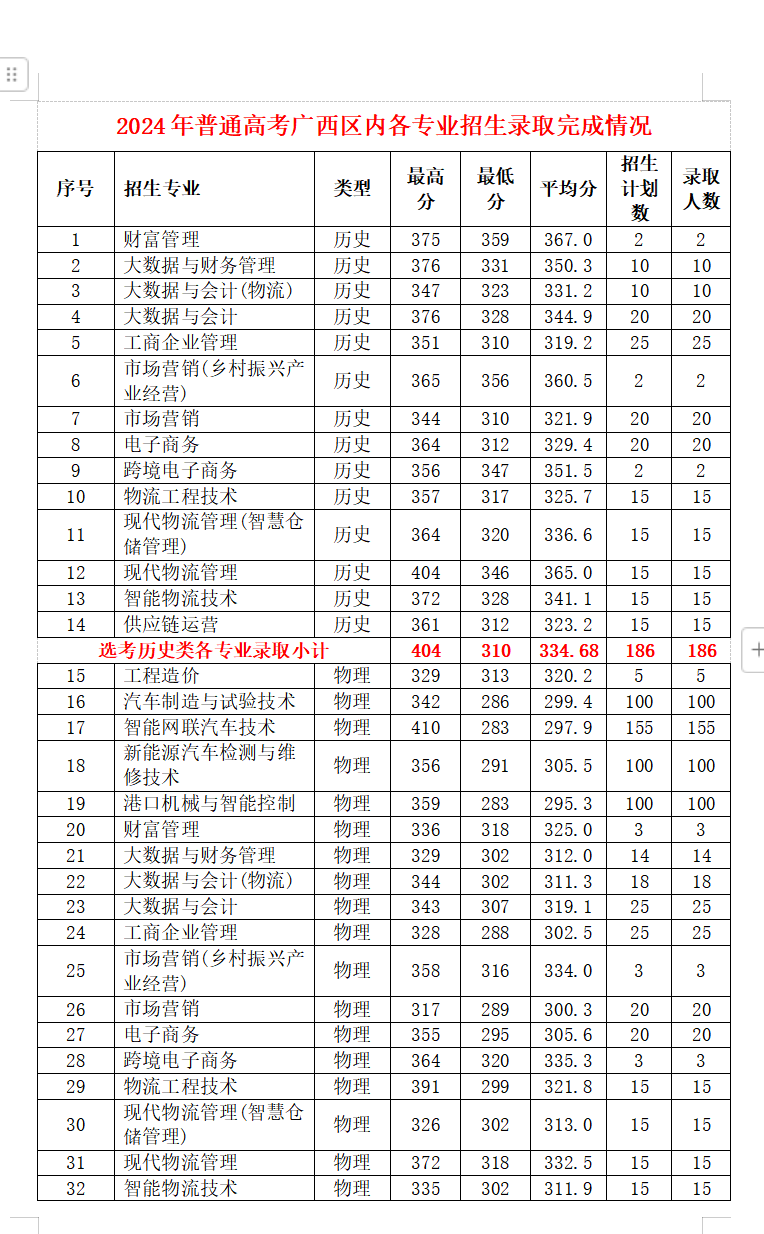 在2024年普通高考录取1383人中,广西区内录取897人、广西区外20个省份共录取486人。广西区内生源质量稳步提升,录取选考物理科的新生711人,最高分410分,最低分282分,平均分303.09分;录取选考历史科的新生186人,最高分404分,最低分310分,平均分334.68分。