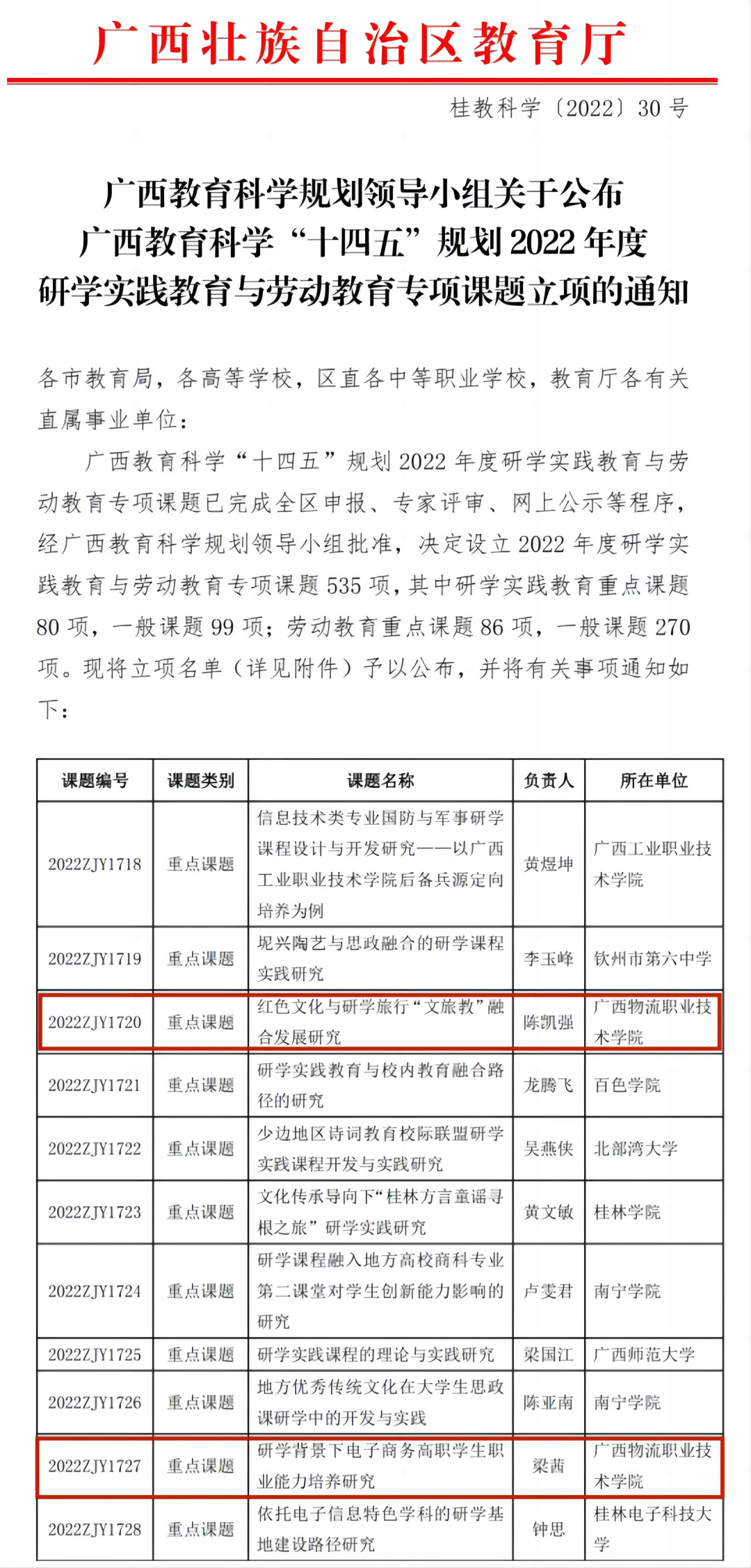 ▲beat365官网申报的广西教育科学“十四五”规划2022年度研学实践教育与劳动教育专项课题获3项重点课题立项,2项一般课题立项
