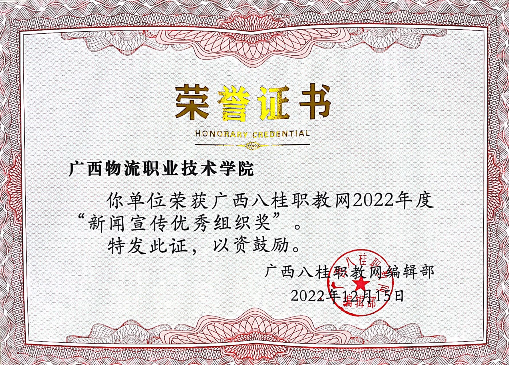 ▲学院获得2022年度广西八桂职教网“新闻宣传优秀组织奖”