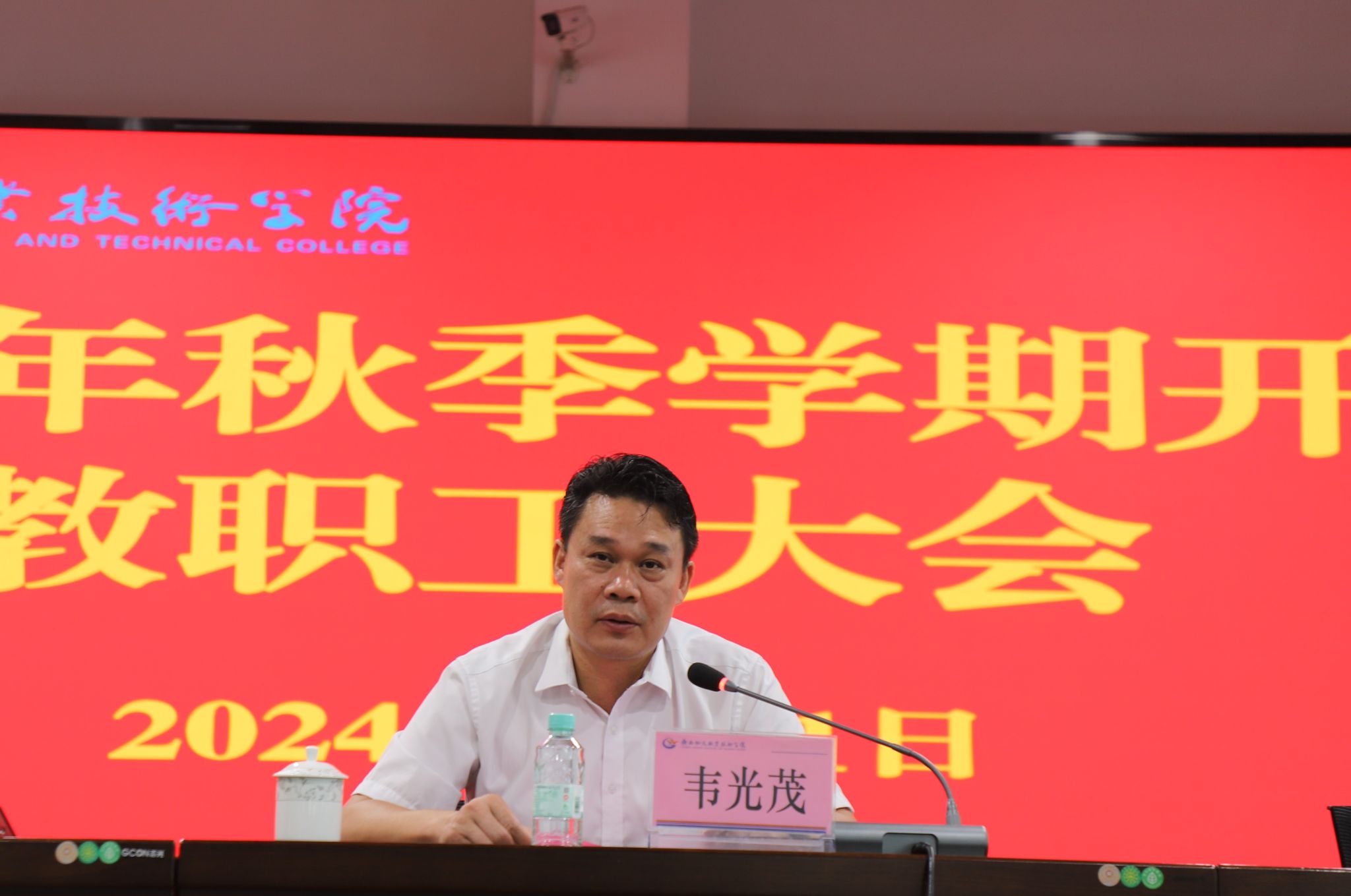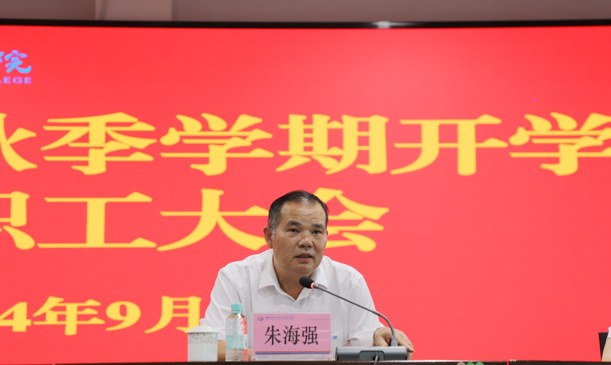 在金风送爽的美好时节,为凝聚起高质量发展的共识和合力,2024年9月1日,学院召开2024年秋季学期开学教职工会议。学院党委书记韦光茂,党委副书记、院长朱海强出席会议并讲话,会议由党委副书记、工会主席杨一笔主持,领导班子成员覃丽燕、陈继文、梁杰出席大会。