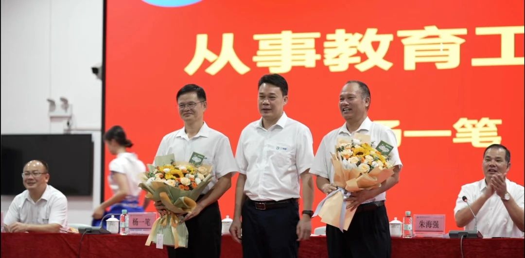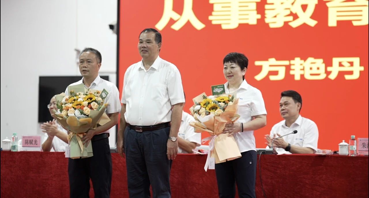 会议宣读了《关于2023年教师节表彰的决定》和从教满20年及以上教师名单,为从教满20年及以上教师献花。从教30年教师代表覃南图和优秀教师代表易美围绕教学育人过程中感悟、体会和经验作交流发言。