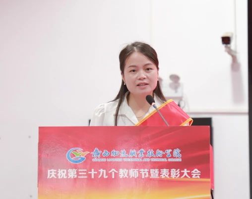 2023年9月10日,学院在二号实训楼召开庆祝第39个教师节暨表彰大会,激励全校教师积极投身教育强国建设实践,充分展现新时代新征程高质量教师队伍建设的突出成就和广大教师立德树人、自信自强的精神风貌。学院党委书记韦光茂出席大会并讲话。党委副书记、院长朱海强主持大会并传达学习习近平总书记致信全国优秀教师代表座谈会教师代表精神。学院领导班子成员杨一笔、覃丽燕、陈赋光及全体教职工参加大会。