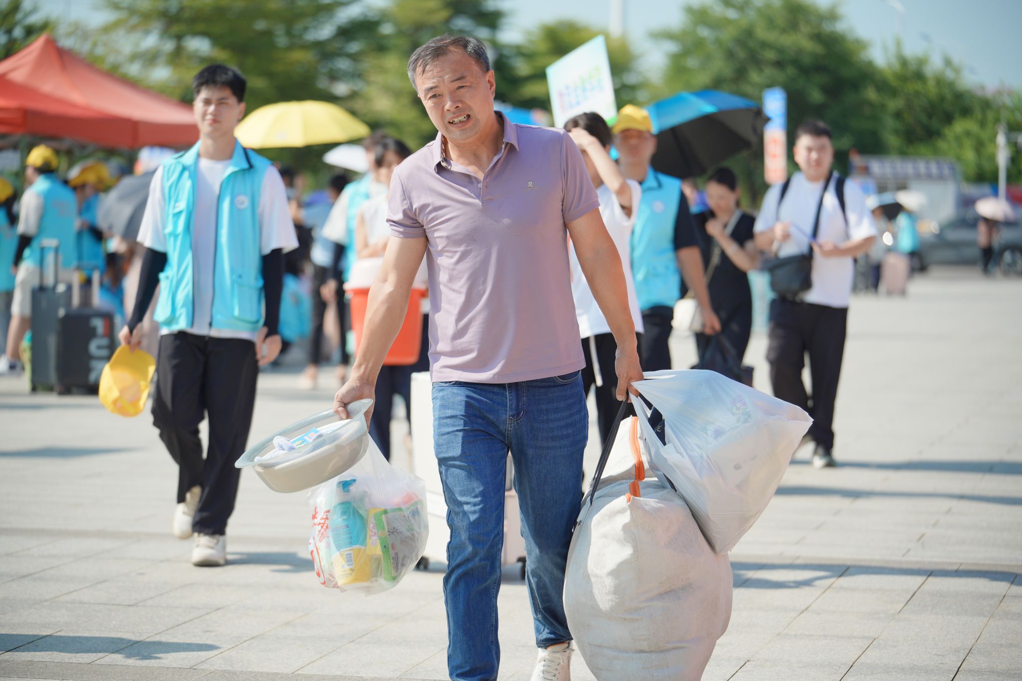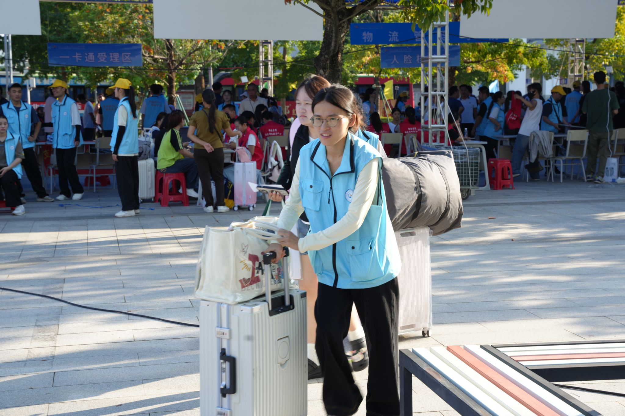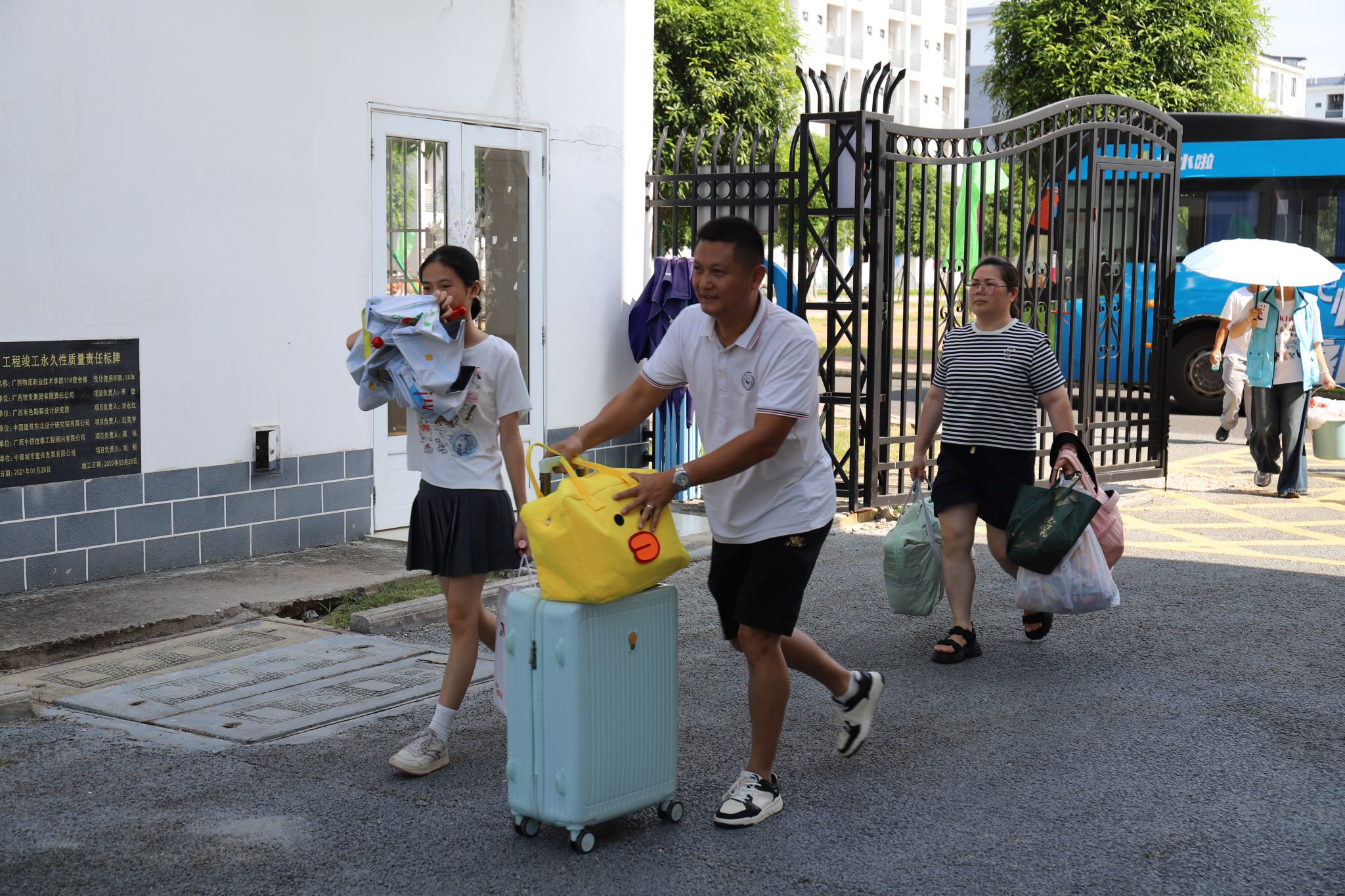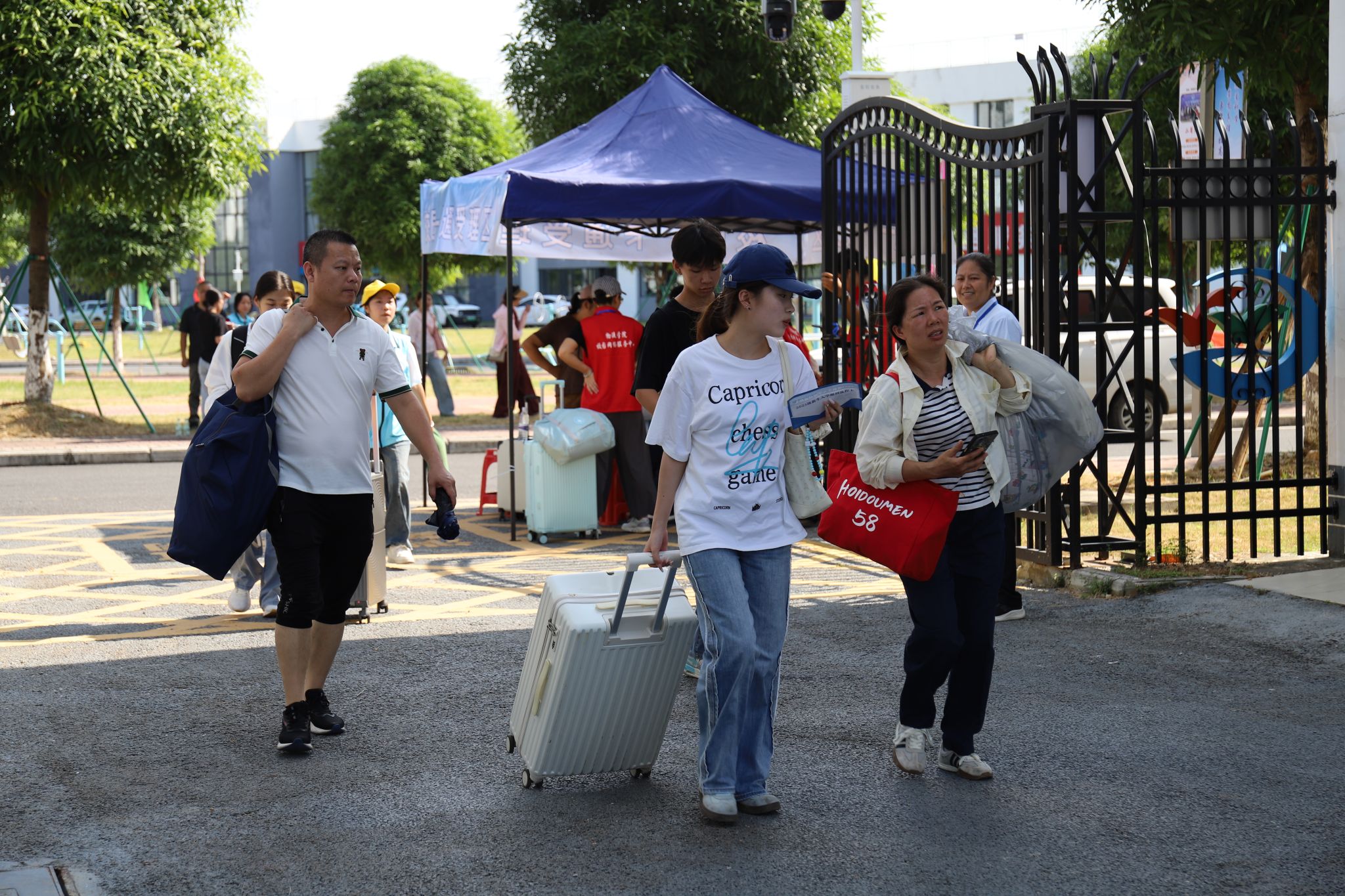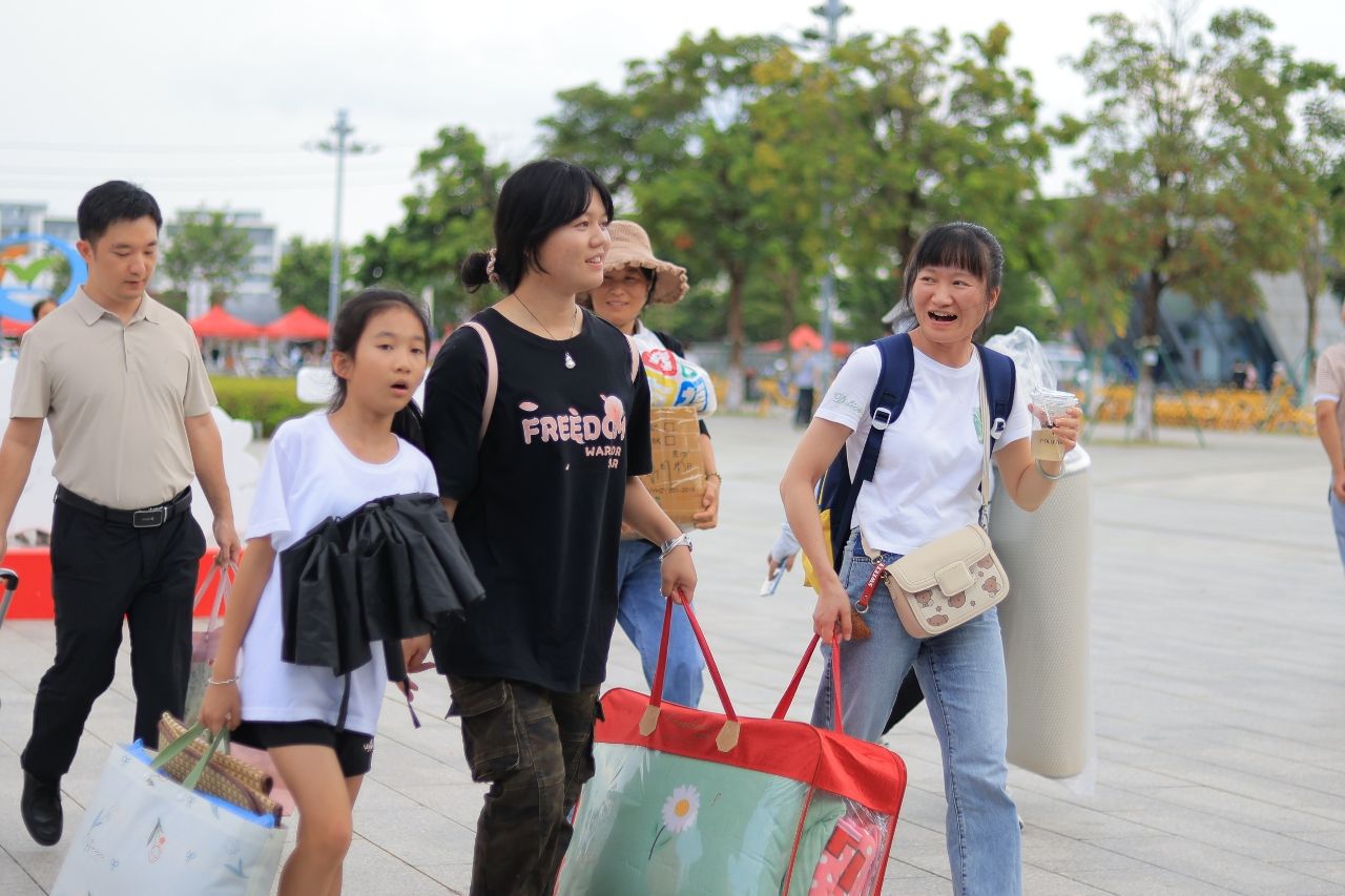 校园里随处可见扛着行李的家长