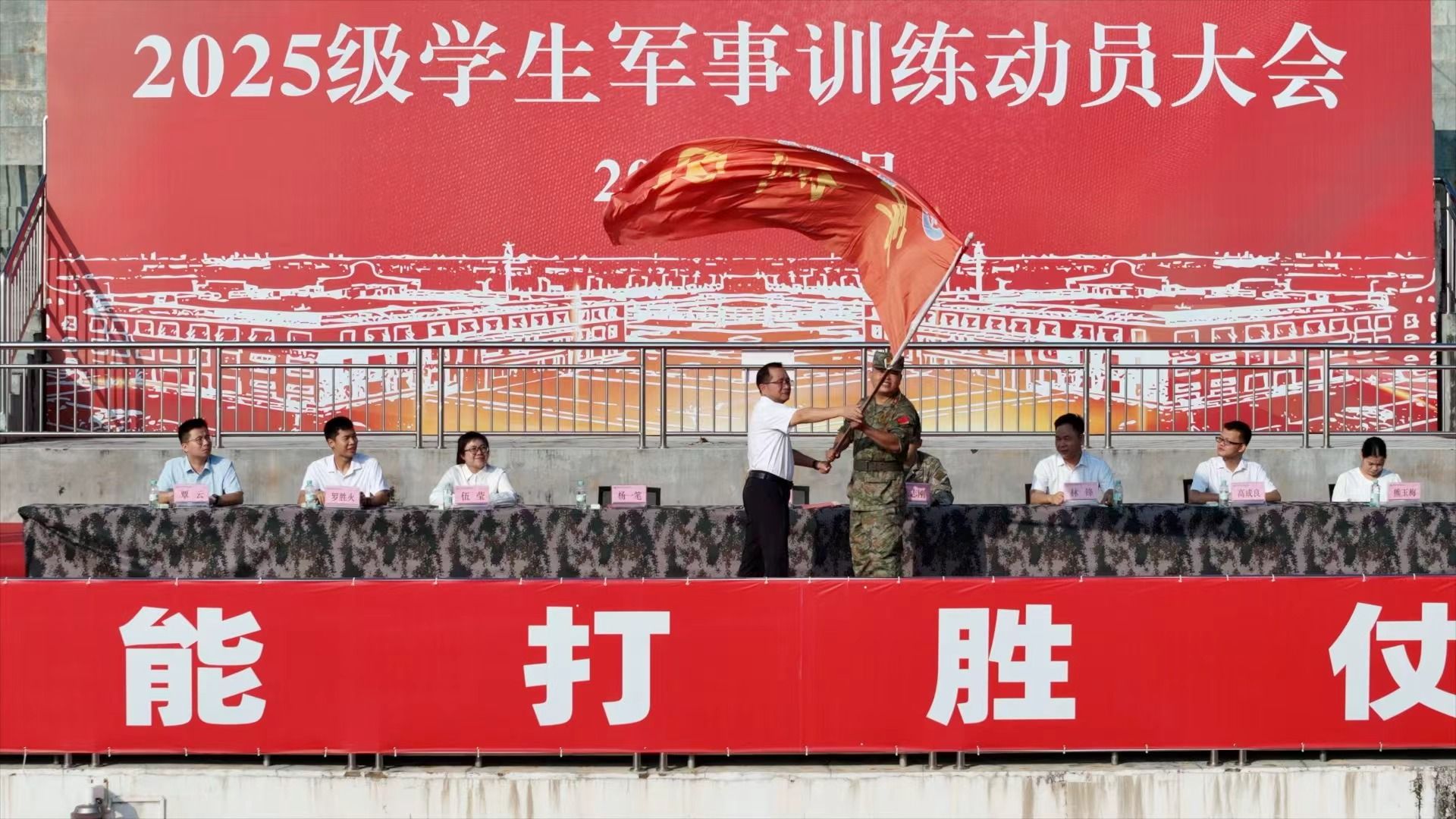 ▲漆辉向2025级学生军训团授旗