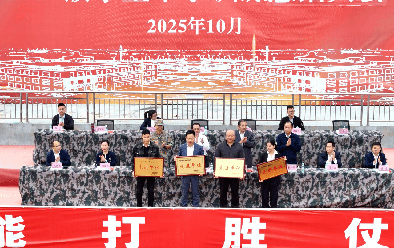 大会对“军训工作先进单位”进行嘉奖,表彰在军训组织协调、学风纪律管理、训练成果转化等方面表现优异的单位。漆辉、朱海强、贵港军分区代表、杨一笔共同为获奖单位颁奖。