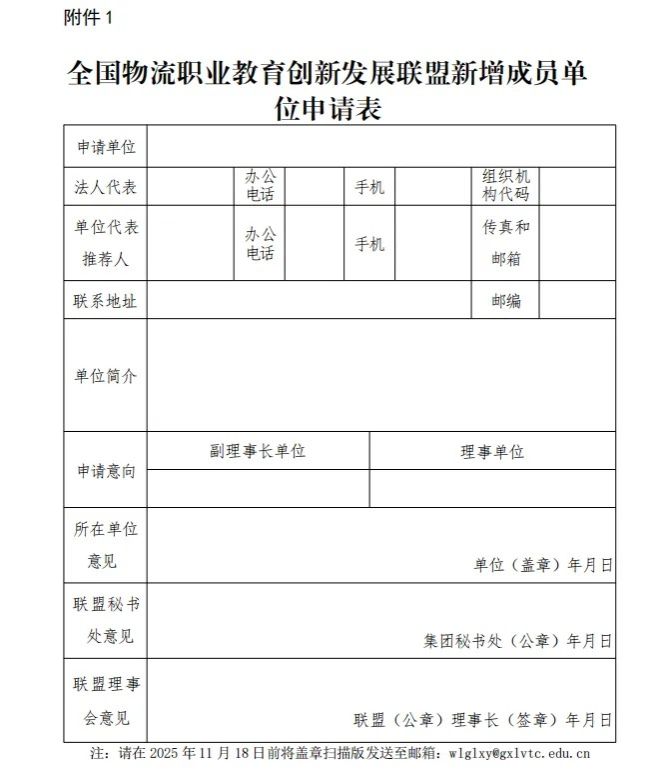 (二)意向新增加入全国物流职业教育创新发展联盟的单位请填写《全国物流职业教育创新发展联盟新增成员单位申请表》(附件1),并于2025年11月18日前将盖章扫描版发送至邮箱:wlglxy@gxlvtc.edu.cn