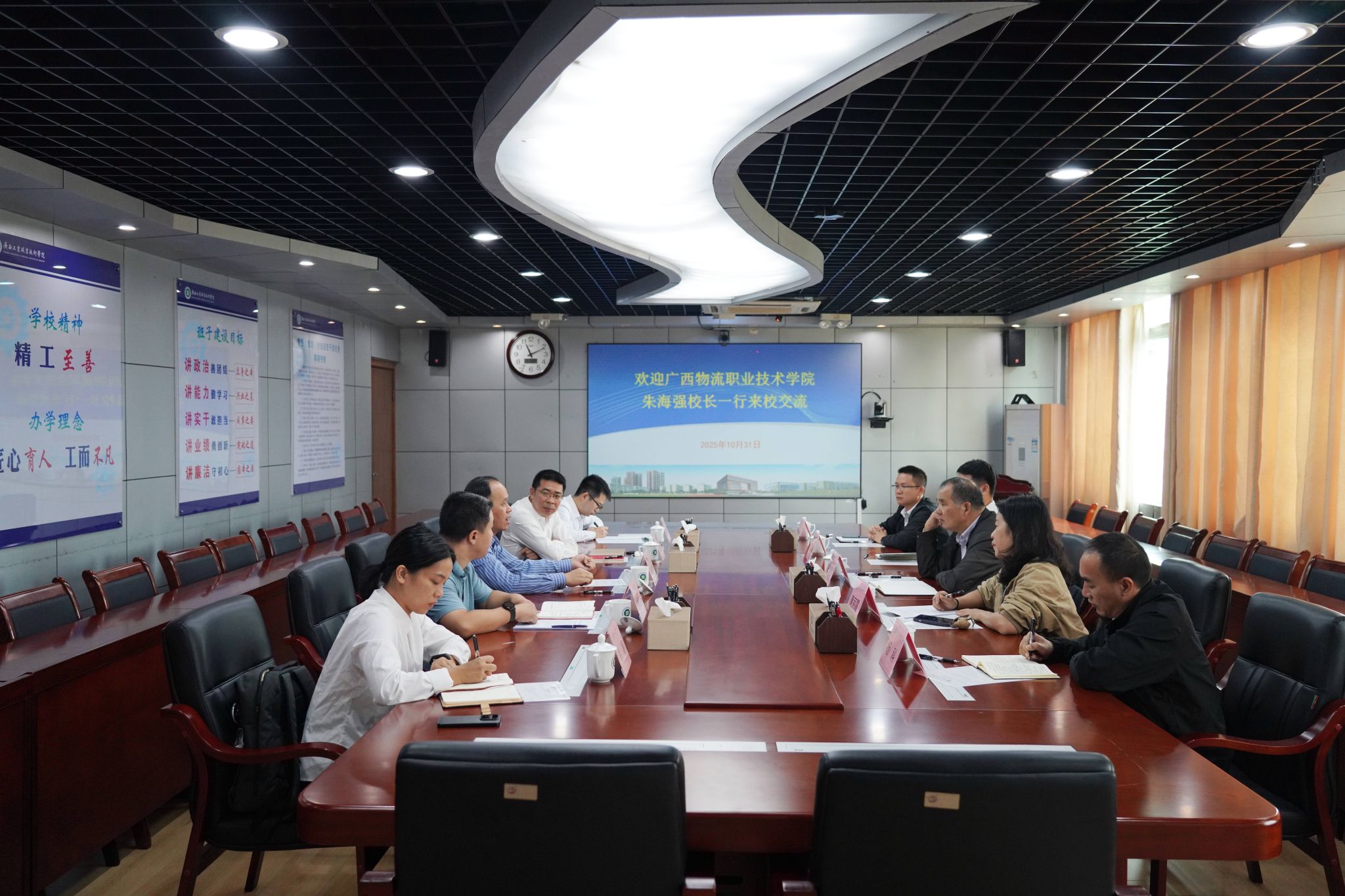 2025年10月31日,beat365官网党委副书记、校长朱海强率队赴广西工业职业技术学院开展交流学习。广西工业职业技术学院党委副书记、校长黄政艳,工业互联网学院院长刘星毅、教务处副处长度国旭参与座谈交流。