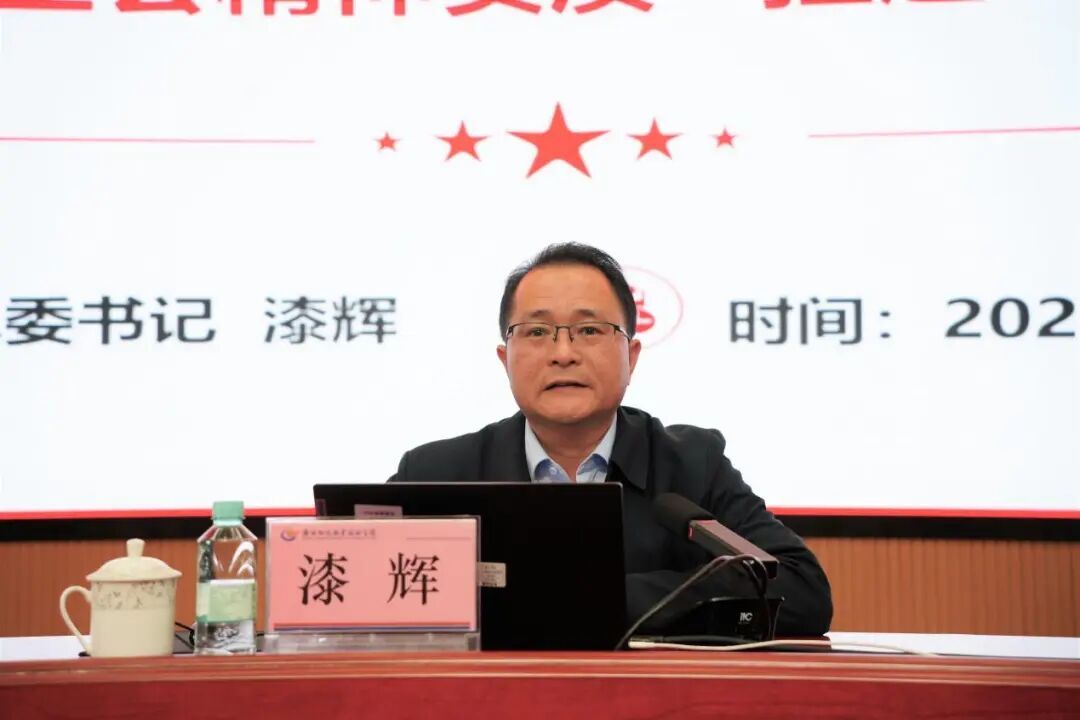 ▲党委书记漆辉面向各职能部门、马克思主义学院职工及学生代表宣讲党的二十届四中全会精神