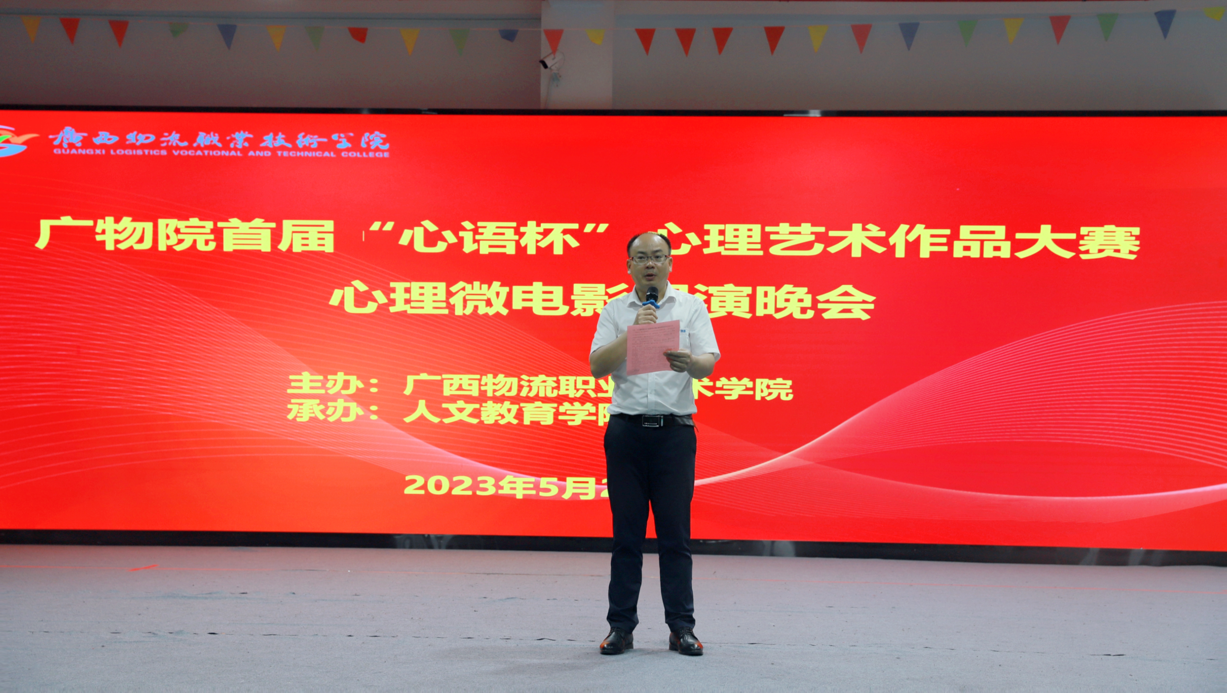 为迎接第十七届“5.25”大学生心理健康日,提升beat365官网大学生心理健康素养,培育大学生自尊自信、理性平和、积极向上的健康心态,营造有利于大学生身心健康发展的良好校园氛围,5月24日晚,人文教育学院举办广物院首届“心语杯”心理艺术作品大赛心理微电影展演晚会。学院副院长陈赋光出席活动,学生工作部部长林锋、人文教育学院党支部书记罗胜火及学生代表到场观看。