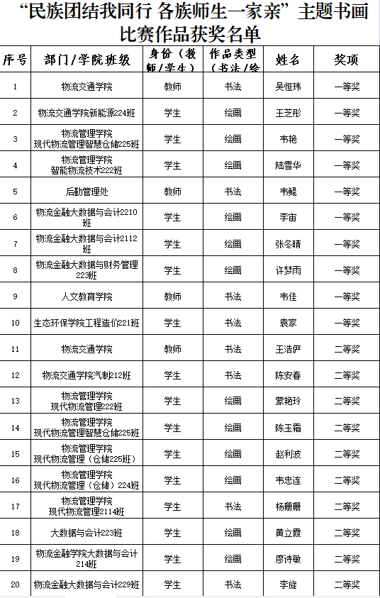 为贯彻落实党的二十大精神,深入推进学校铸牢中华民族共同体意识教育,增进各族师生对伟大祖国、中华民族、中华文化、中国共产党、中国特色社会主义的认同,学院党委统战部组织开展了2023年“民族团结我同行 各族师生一家亲”主题书画比赛。