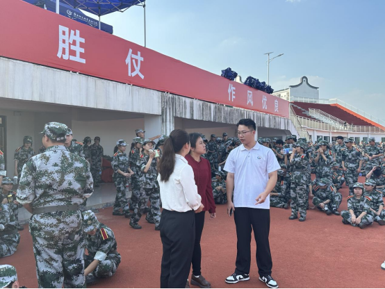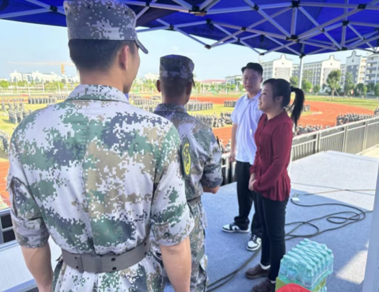 23级辅导员来到西行运动场现场了解参训学生的训练情况,对承训教官和2023级全体参训学生进行慰问,并为教官送上饮用水。