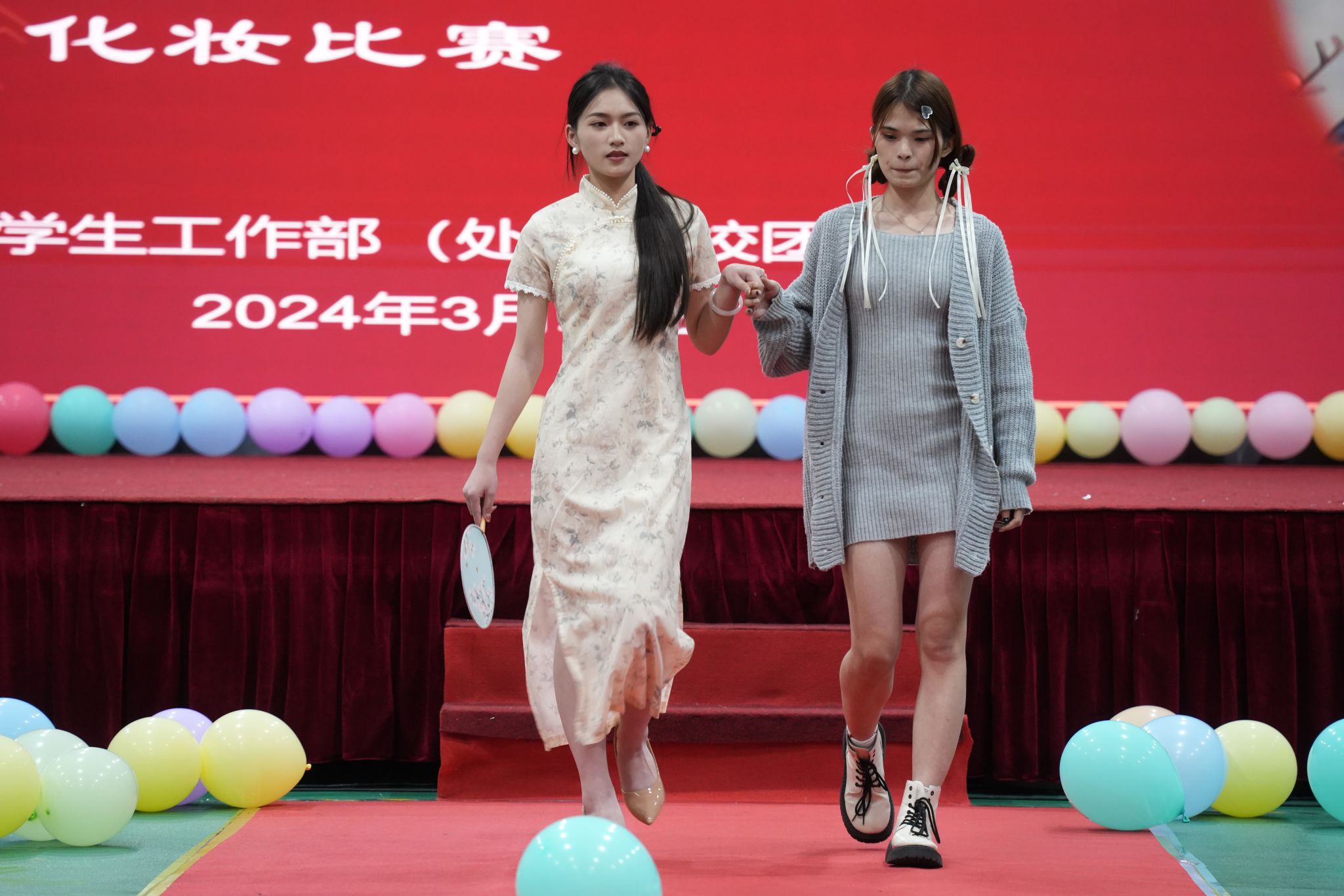 本次比赛舞台走秀的形式开展。随着音乐社的一首《半壶纱》,本场比赛正式拉开序幕。在活动中,参赛选手各显身手,高超的化妆技术充分展示相应的素质,比赛规定时间为60分钟,在紧张有序的氛围中,选手们从底妆到眉毛,再到眼妆、眼线、睫毛、腮红、口红……整个化妆步骤有条不紊的进行。走秀过程中,各组选手更是凭着自己精致的妆容,精美的配饰,别具一格的服装搭配,给观众呈现了一场美轮美奂的视觉盛宴,让人应接不暇。