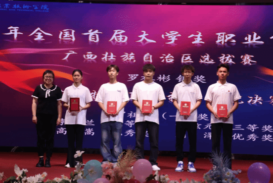 杨一笔、莫军为获得广西职业院校技能大赛奖项的同学们颁奖
