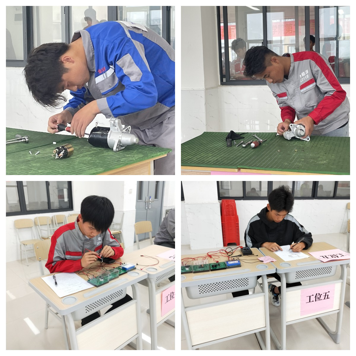 本次竞赛为个人赛。共设起动机拆装与检测、电路搭建与基本物理量测量两个单项,每位参赛选手依次完成两个单项的比赛,根据得分高低确定名次。每场比赛开始前,工作人员与评委协调开考时间,吹哨子,发出开考指令,比赛正式开始。