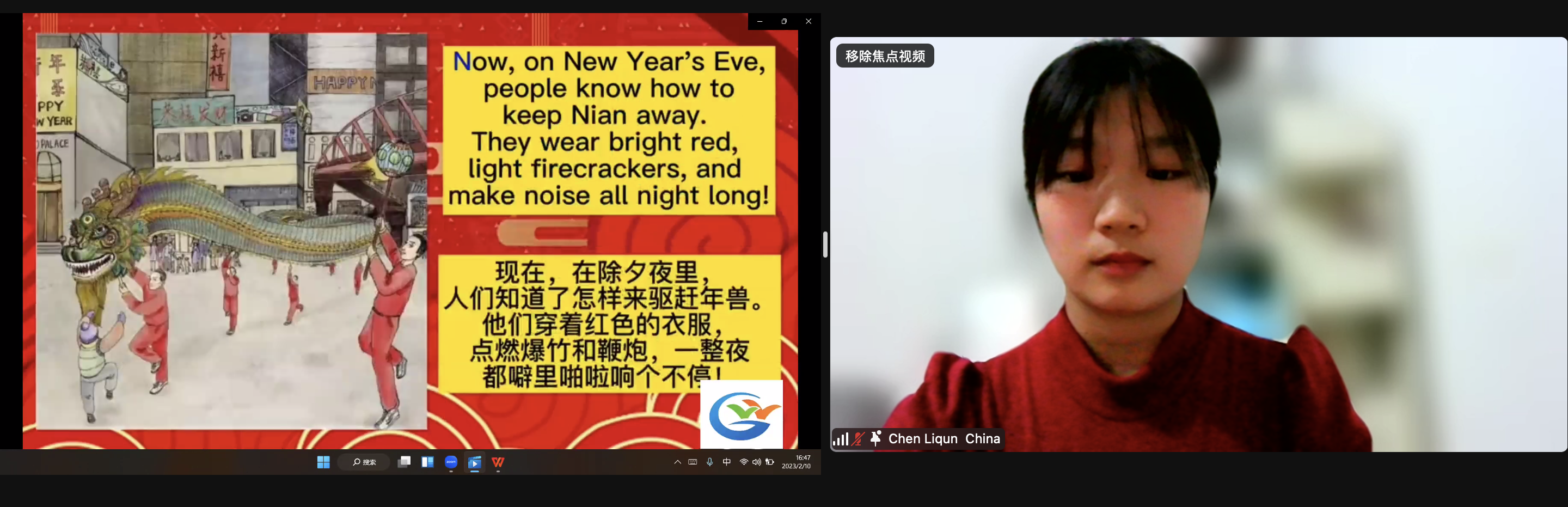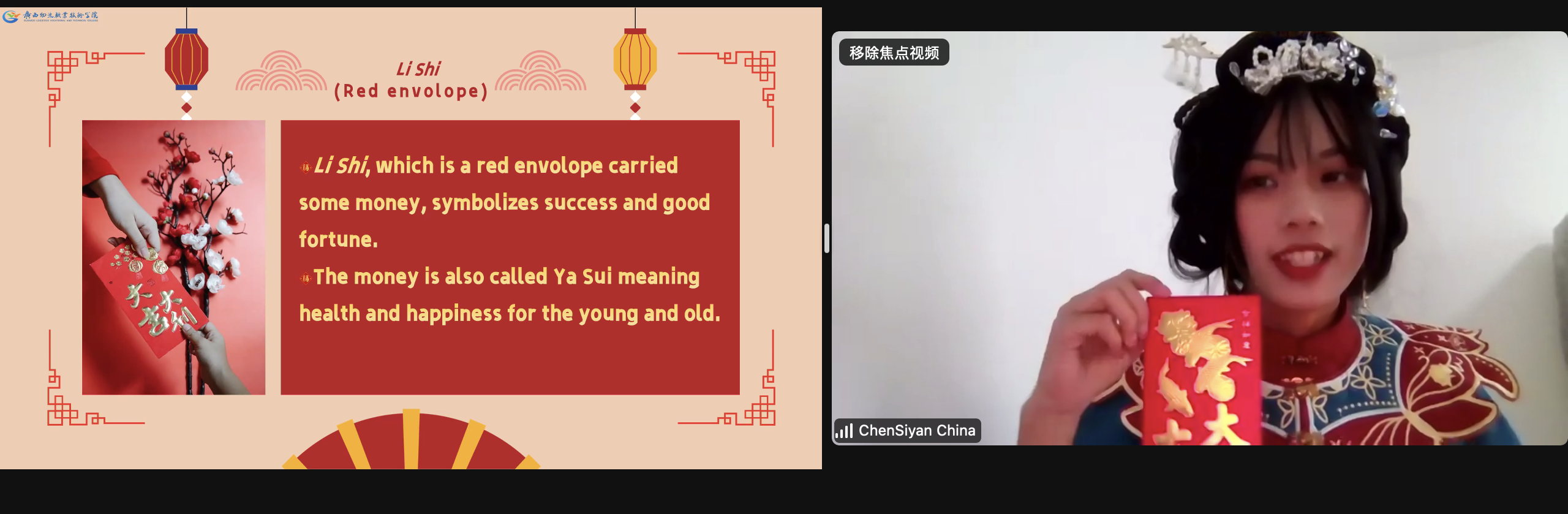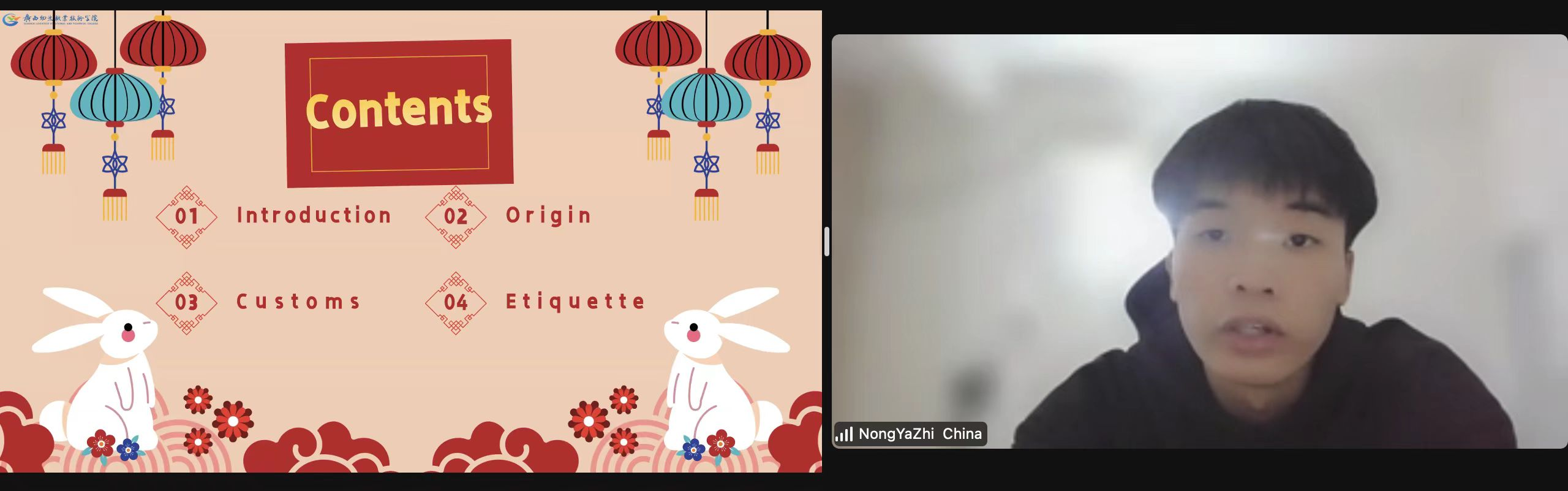 在活动中,beat365官网农雅智、陈利群、陈思燕、吴科四位同学在人文学院黄鸿琴老师及国际教育学院刘彩芳老师的指导下,用英文向俄罗斯、东南亚等联盟院校以及区内兄弟院校的师生介绍了我们中国春节的起源、习俗以及拜年礼仪等。