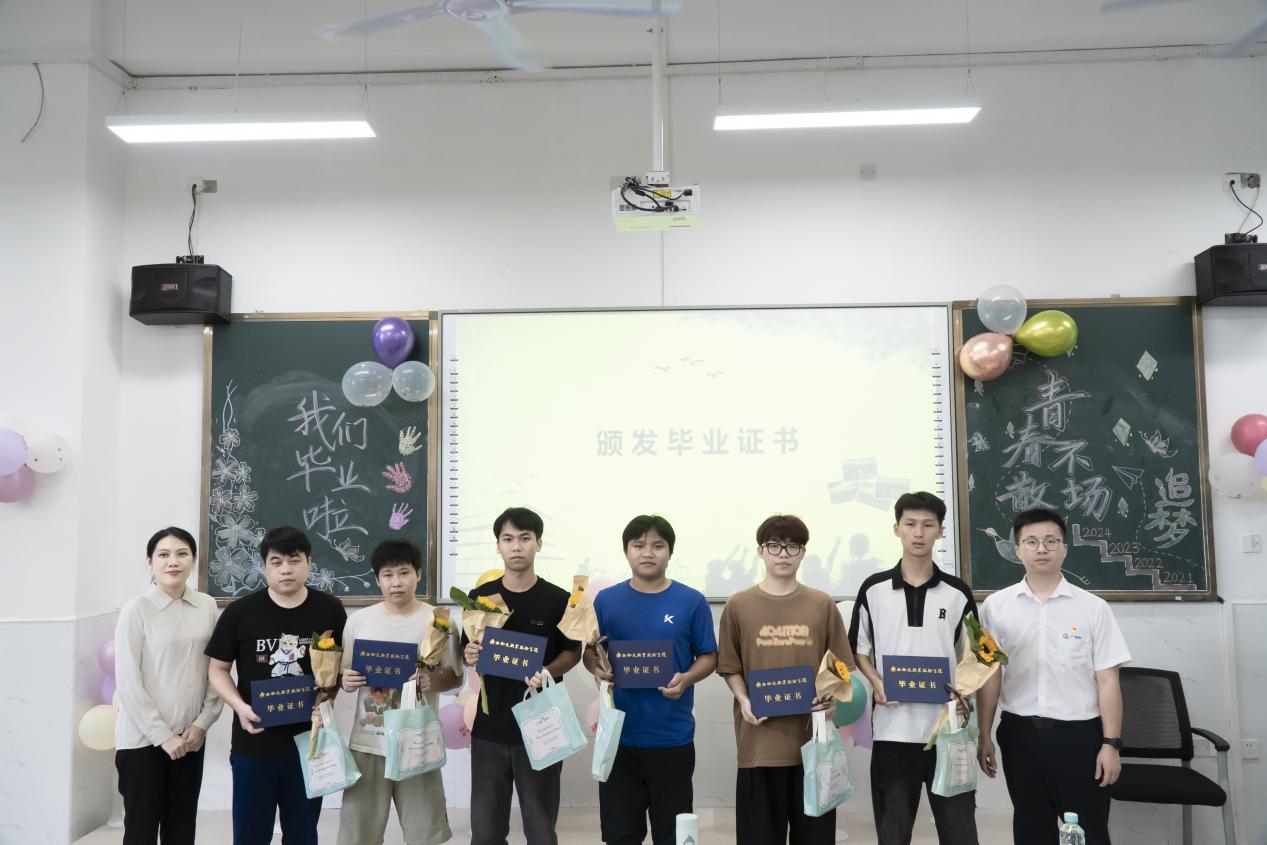 在颁发毕业证书的环节,每位毕业生手捧向日葵充满喜悦地走上舞台,接过象征着他们努力和成果的证书,与老师们合影留念。