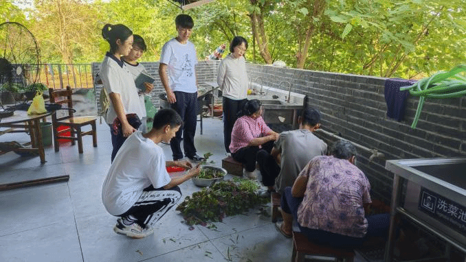 在高岭村和山泉村的爱心食堂,师生们看到了企业援建、村“两委”监导、村合作社资金支持,依托企业的“万得厨+预制菜、净菜或裸菜”的助餐养老创新模式,实现企业、村委、合作社、部队、学校、社会公益人士多方参与,以直播带动企业、学校以及乡村特色资源的良性互动,实现小小爱心食堂吃出“政企军民+N”的大幸福。在冲口屯,长者食堂对行动不便老人的送餐服务得到了村民的一致点赞;老人们的公益劳动可以变成积分,在积分超市兑换相应价位的商品,让师生看到乡村治理的新方法。在龙井村,师生通过与村支书、村妇联主任的访谈以及村史馆的参观学习较为深入地了解了龙井村作为一个多民族聚居的村子是如何在治理上下功夫来促进民族大团结的;在山边村,师生用行走的方式体验美好的生态环境,并通过与游客的访谈了解到山边村的生态建设成效;在樟村,通过入户与村民访谈,了解了樟村的火龙果等产业的发展为村子年终分红奠定了基础;在鹿山村,师生看到了经济发展与生态建设的“两难问题”是如何选择的答案。通过一户户的走访、一个个村委的深入访谈以及实地考察所见,学生们对“‘长者食堂’‘爱心食堂’如何运行”、“积分超市、时间银行怎么操作”、“‘一组两会’是什么以及怎么运行”等真实的乡村生活细节有了更为切身的体会,对乡村助餐养老等基层治理的创新实践有了更多鲜活的认识。