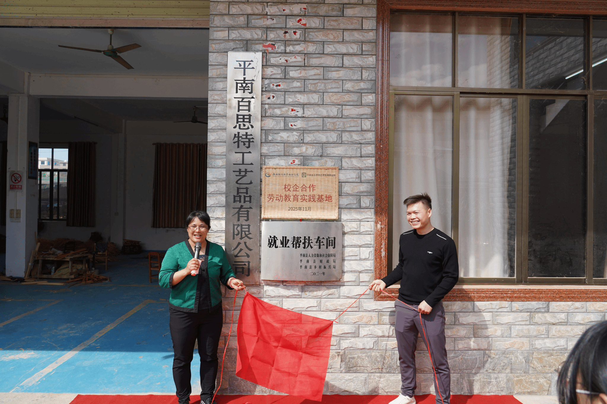 在基地揭牌仪式上,通识教育学院院长罗秀圆与平南山里文化研学基地负责人莫思明共同为"校企合作劳动教育实践基地"揭牌。通过校企合作搭建实践平台,将劳动教育与文化传承深度融合,创新劳动教育模式。