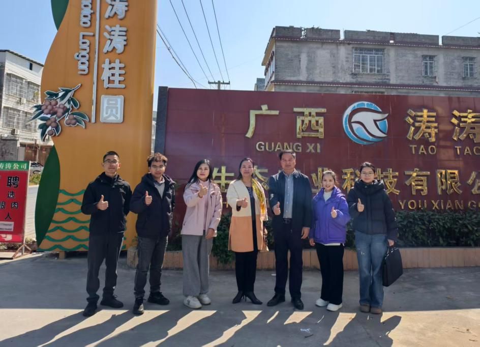 在广西涛涛生态农业有限公司,调研团队参观了加工车间,了解到企业智能化加工流程与特色桂圆烘焙技术,并就农产品标准化种植、品牌化建设等内容交流看法。