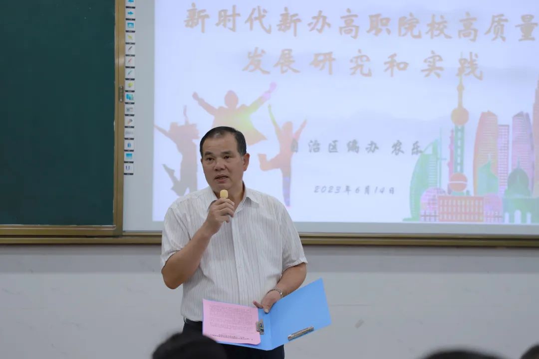 为不断强化内涵建设,积极探索形成新时代高职教育高质量发展的新实践、新路径、新模式,2023年6月14日,中共广西壮族自治区机构编制委员会办公室原副主任农乐到beat365官网开展“新时代新办高职院校高质量发展的实践与研究”专题讲座,学院党委副书记、院长朱海强主持讲座。纪委书记覃丽燕及教职工代表参加活动。