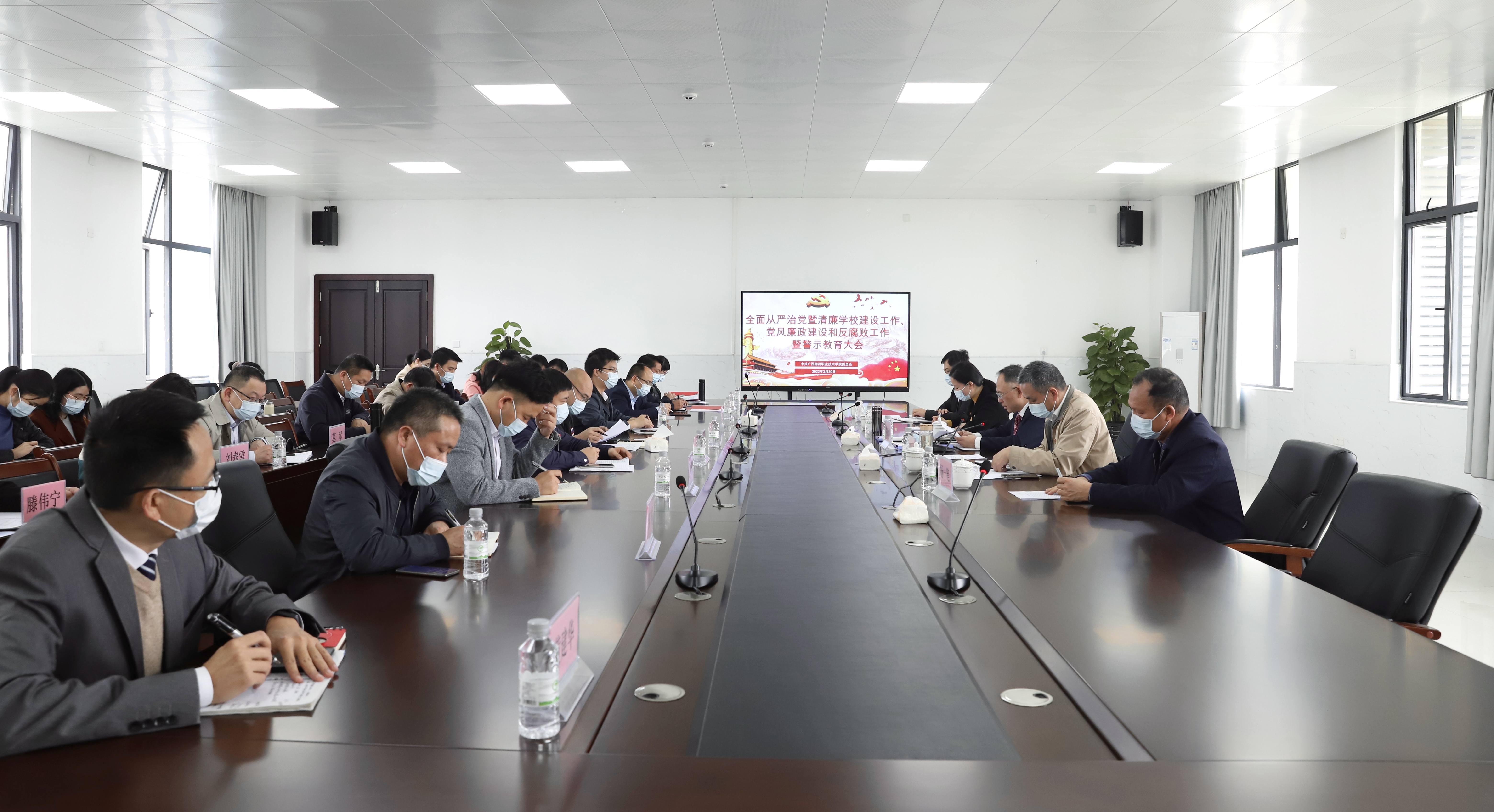 3月30日,学院党委全面从严治党暨清廉学校建设工作会议召开。会议传达了全区教育系统全面从严治党工作暨清廉学校建设动员视频会议精神,回顾总结学院2021年全面从严治党工作,研究部署2022年全面从严治党工作和清廉学校建设工作任务。集团公司副总经理、学院党委书记李卫国出席会议。党委副书记章红平主持会议,纪委书记覃丽燕,副院长杨一笔、李波参加会议。