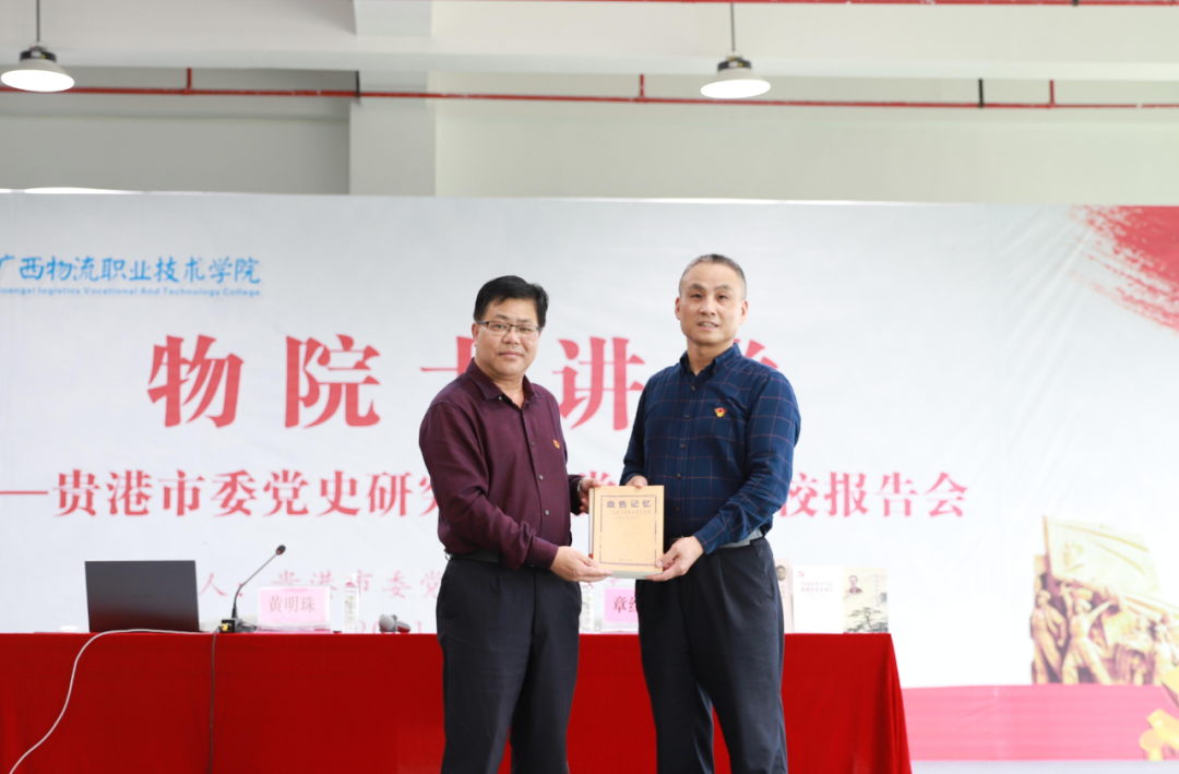 报告会开始前,黄明珠代表贵港市委党史研究室为学院赠党史学习教育书籍,倡导学院全体师生在党史学习教育中先学一步、学深一层,努力做到“学史明理、学史增信、学史崇德、学史力行”。