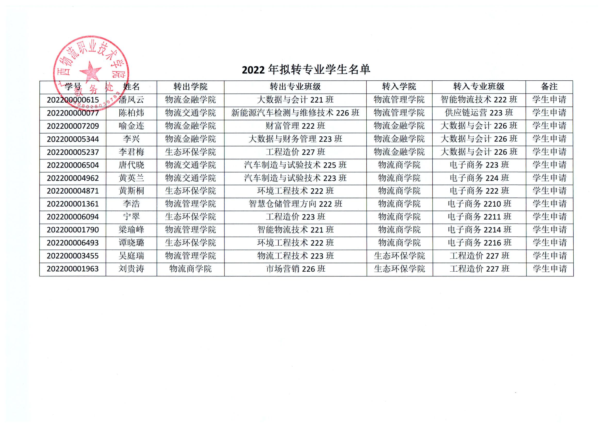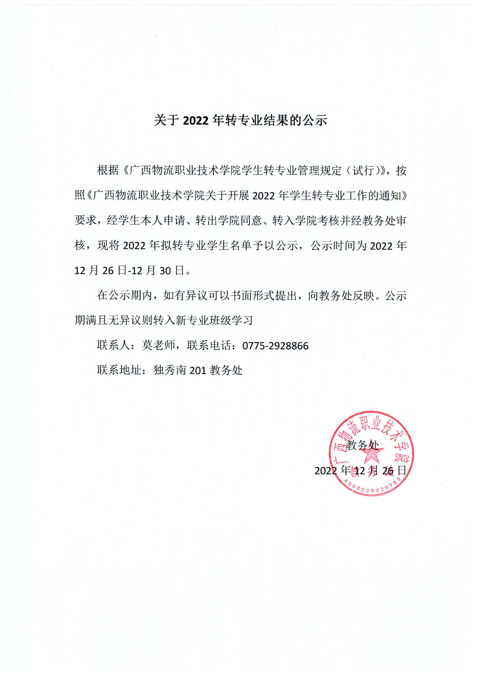 关于2022年转专业结果的公示